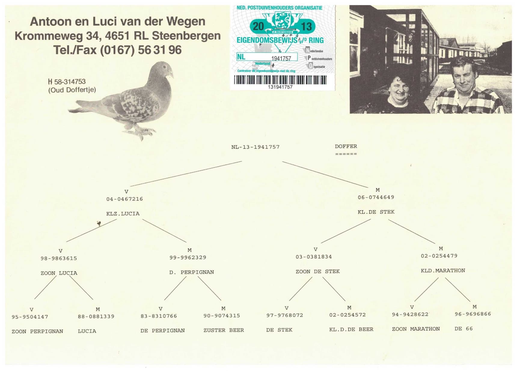 Direct son of “kleinzoon Lucia”, winner of 15th Nat. and 67th Internat. Perpignan 17,24b. – 21st Tarbes ZLU 3,601b. – 139th Nat. Pau