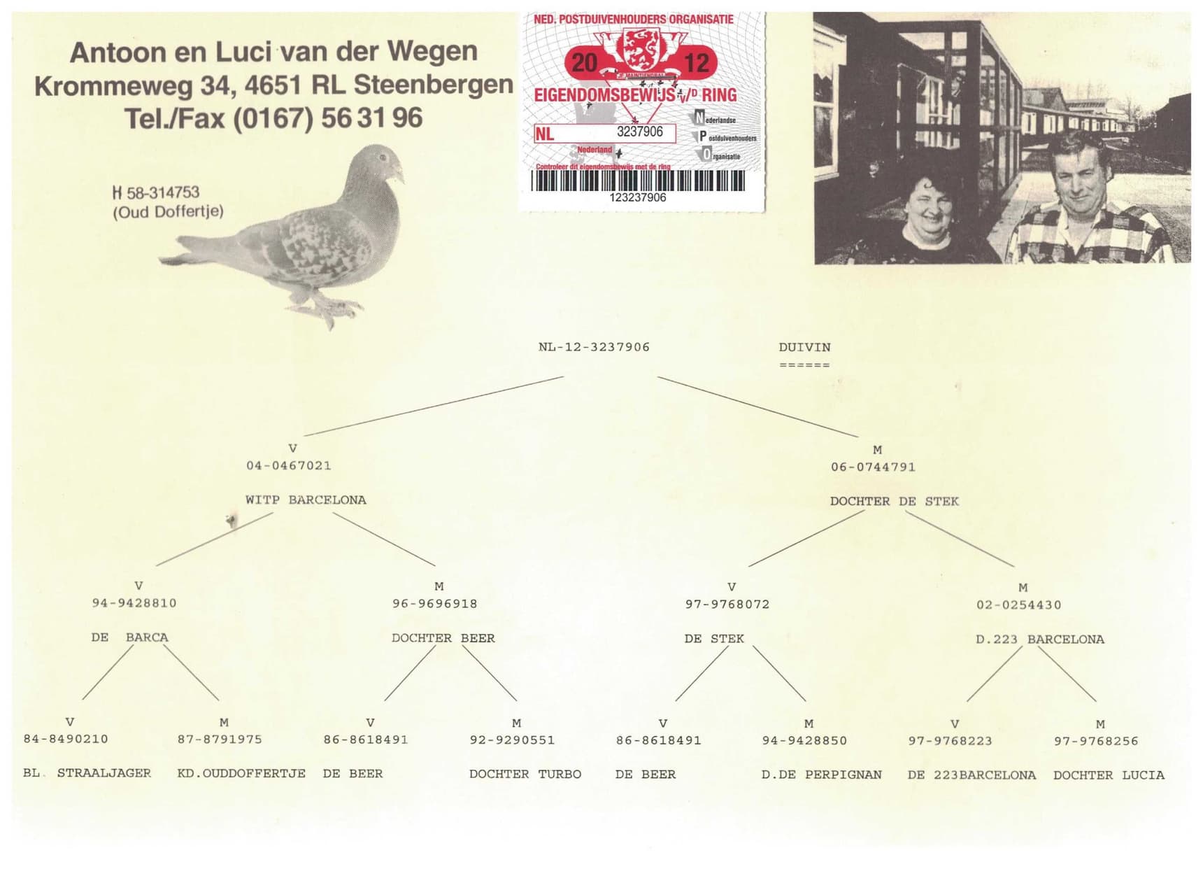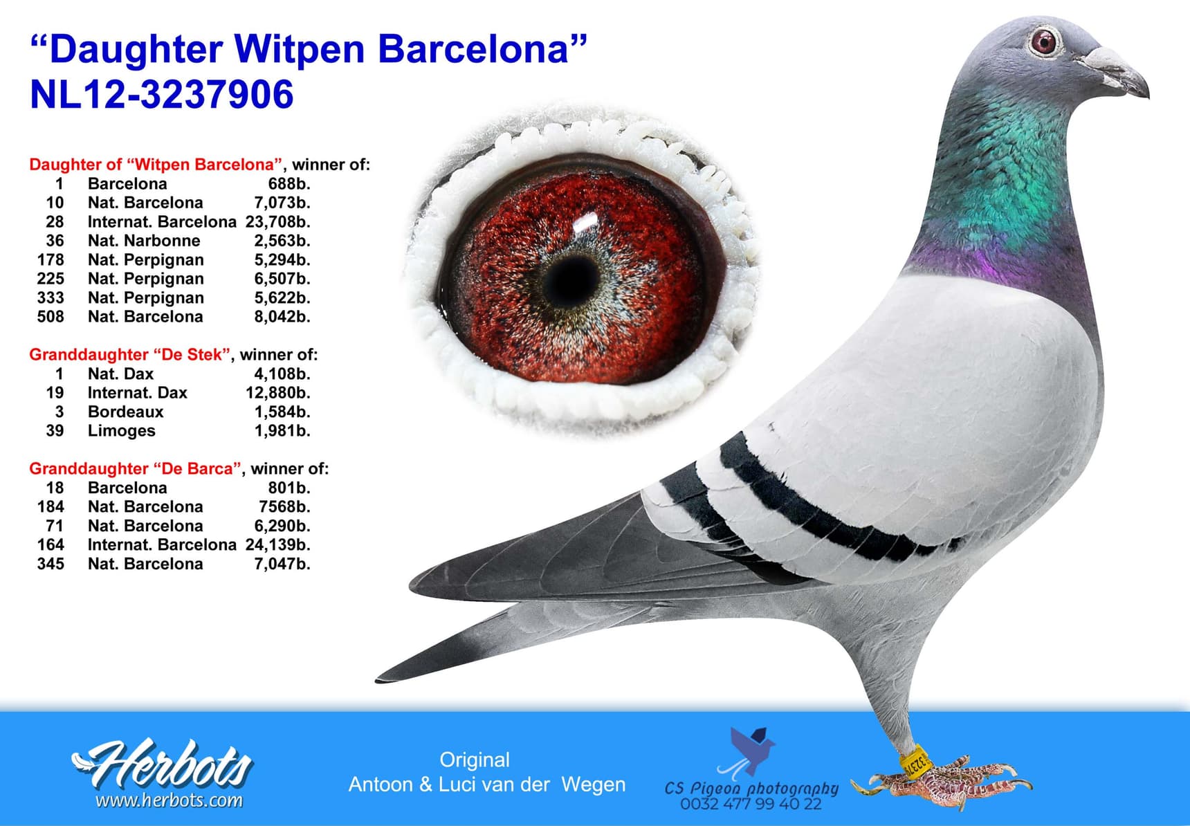 Direct daughter of “Witpen Barcelona”, winner of 10th Nat. Barcelona 7,073b. – 28th Internat. Barcelona 23,708b. – 36th Nat. Narbonne 2,563b. - 178th Nat. Perpignan 5,294b. – 225th Nat. Perpignan 6,507b. - 333rd Nat. Perpignan 5,622b. – 508th Nat. Barcelona 8,024b.