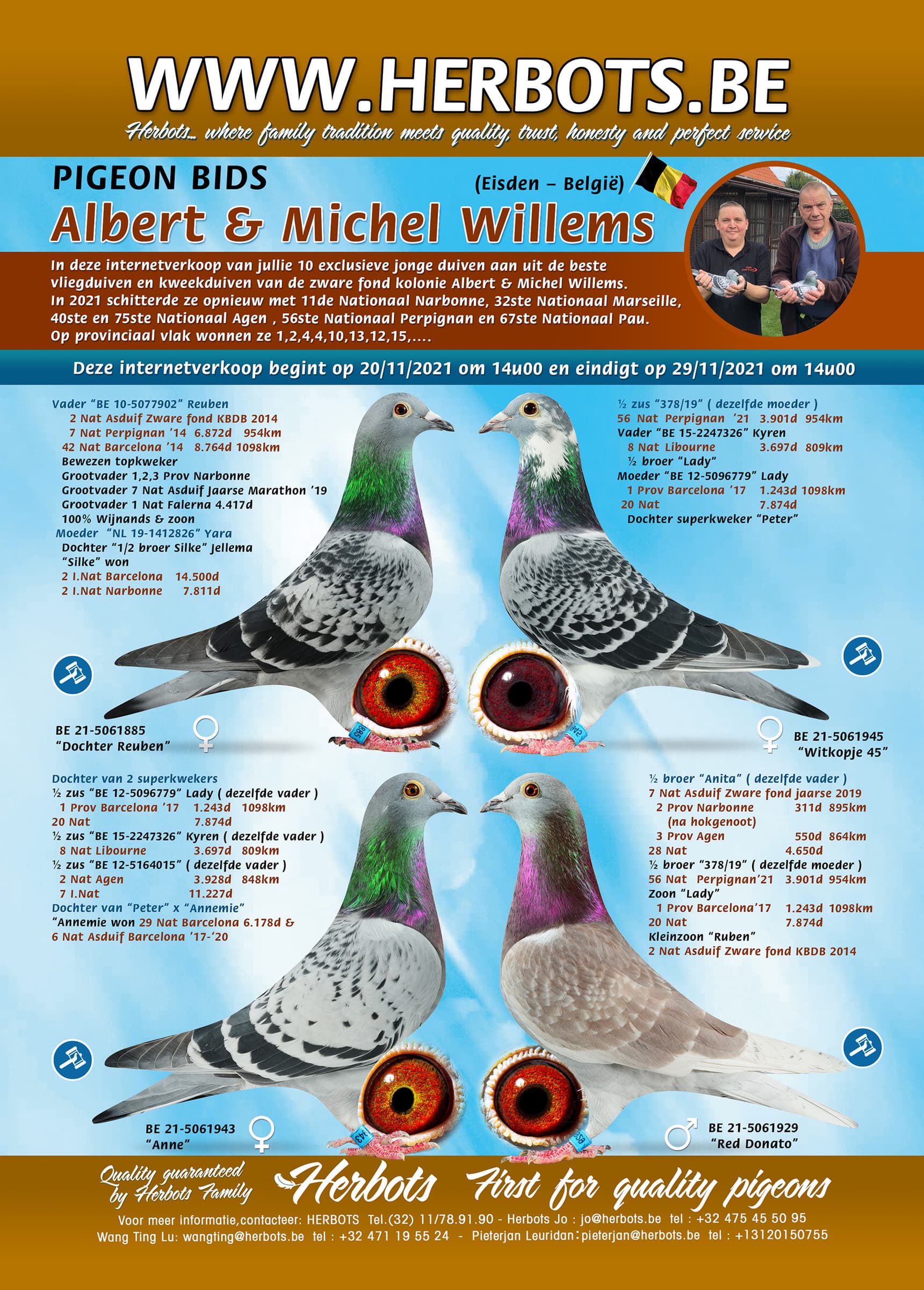 In deze internetverkoop van jullie 10 exclusieve jonge duiven aan uit de beste vliegduiven en kweekduiven van de zware fond kolonie Albert & Michel Willems. In 2021 schitterde ze opnieuw met 11de Nationaal Narbonne, 32ste Nationaal Marseille, 40ste en 75ste Nationaal Agen , 56ste Nationaal Perpignan en 67ste Nationaal Pau. Op provinciaal vlak wonnen ze 1,2,4,4,10,13,12,15,….