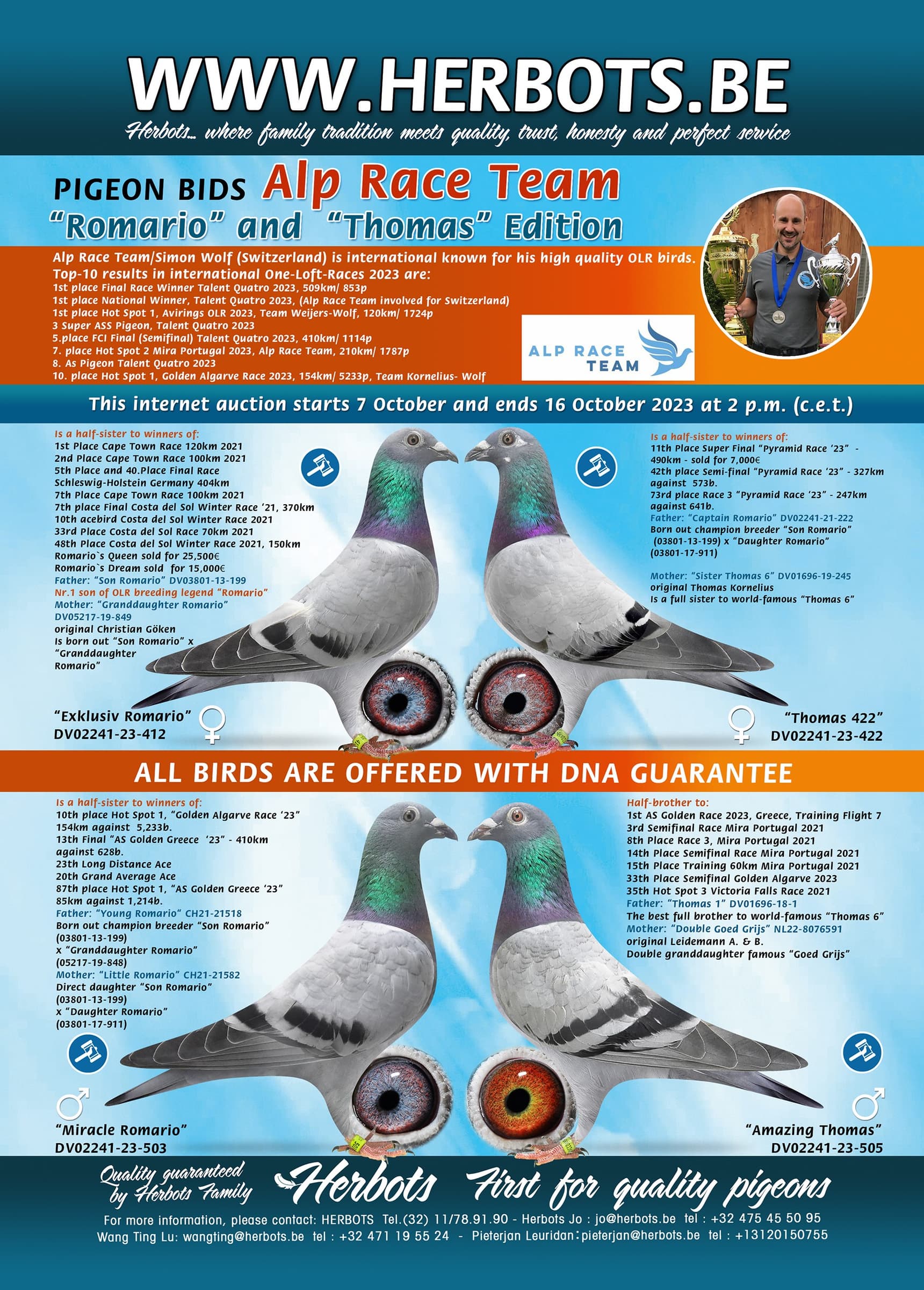 Alp Race Team/Simon Wolf (Switzerland) is international known for his high quality OLR birds. Especially for Pigeon Bids Simon selected top birds all born out his proven winning OLR birds and golden breeding lines of "Romario" and "Thomas"