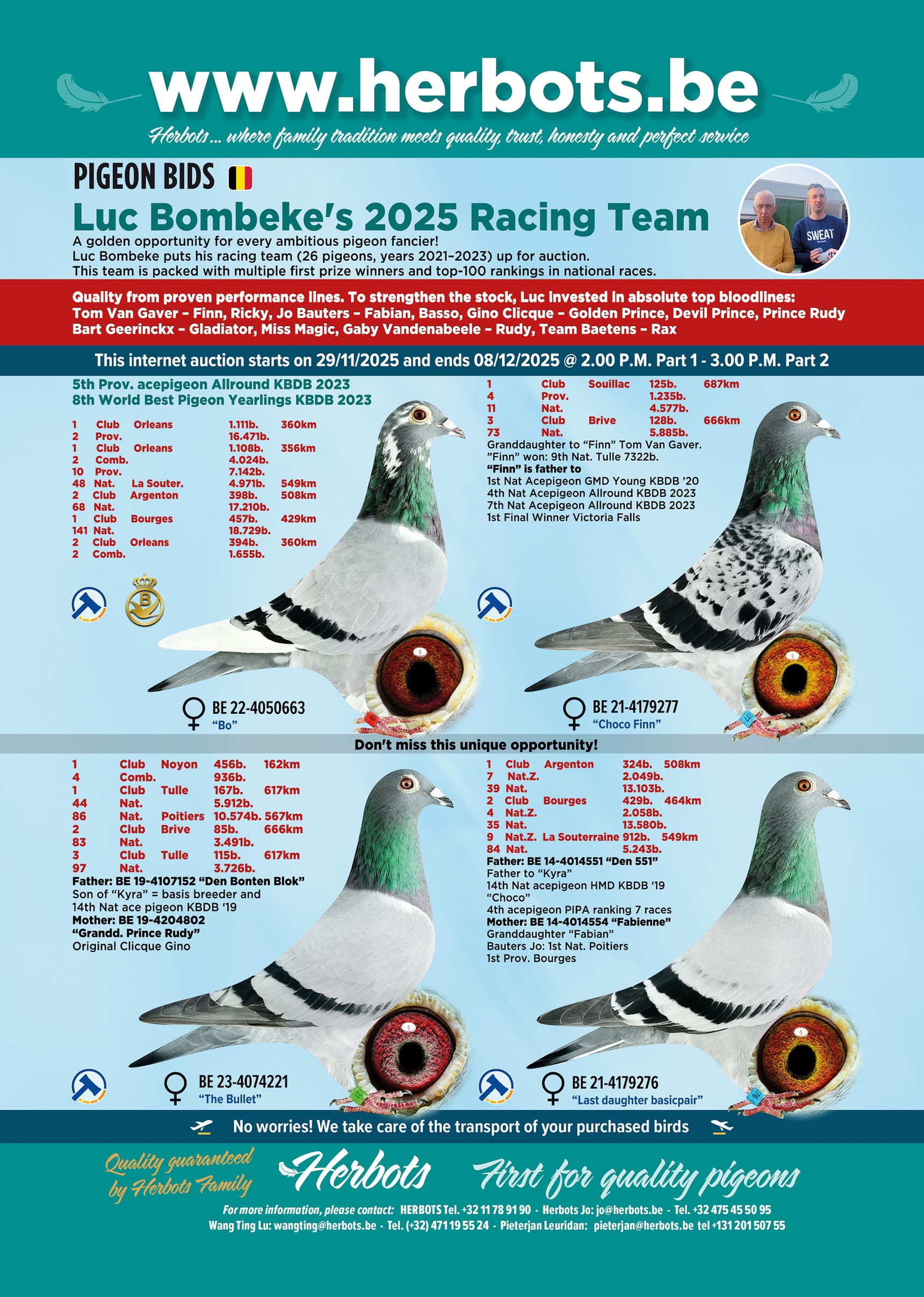 Luc Bombeke brengt zijn vliegploeg (26 duiven, jaargangen 2021–2023) onder de hamer. Deze ploeg staat bol van meervoudige 1e prijswinnaars en top-100 klasseringen op nationale vluchten.