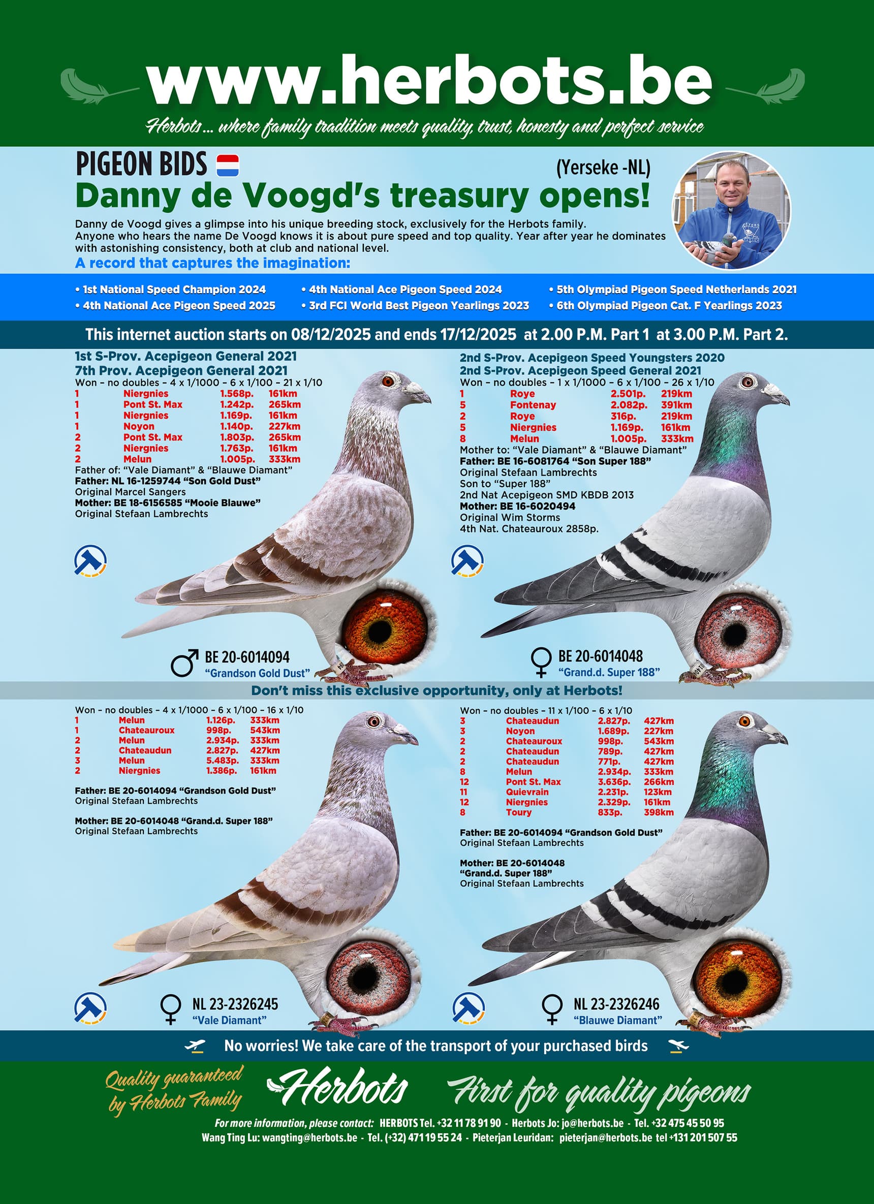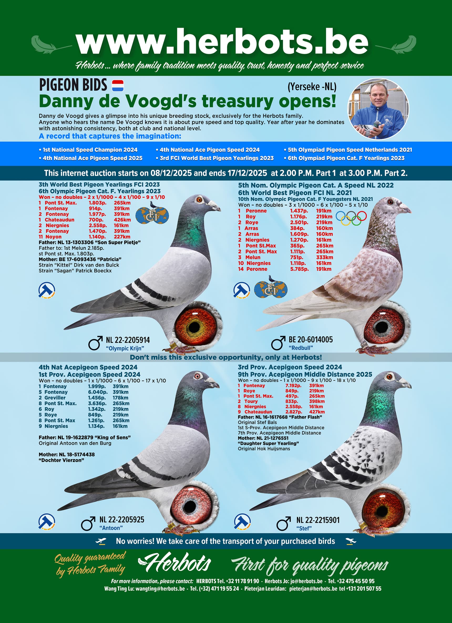 In deze veiling van 34 duiven worden de absolute kroonjuwelen gepresenteerd: rechtstreeks uit zijn beste lijnen, waaronder:
