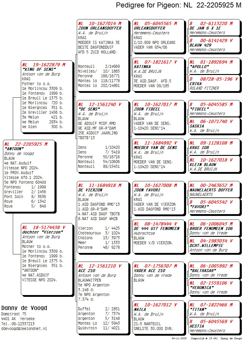 “De Vierzon” Willem de Bruijn 4th Nat. Acepigeon GMD TBOTB – 8th Nat. Acepigeon GMD WHZB – 1 Vierzon 4.425p. – 1 Meer 1.333p.