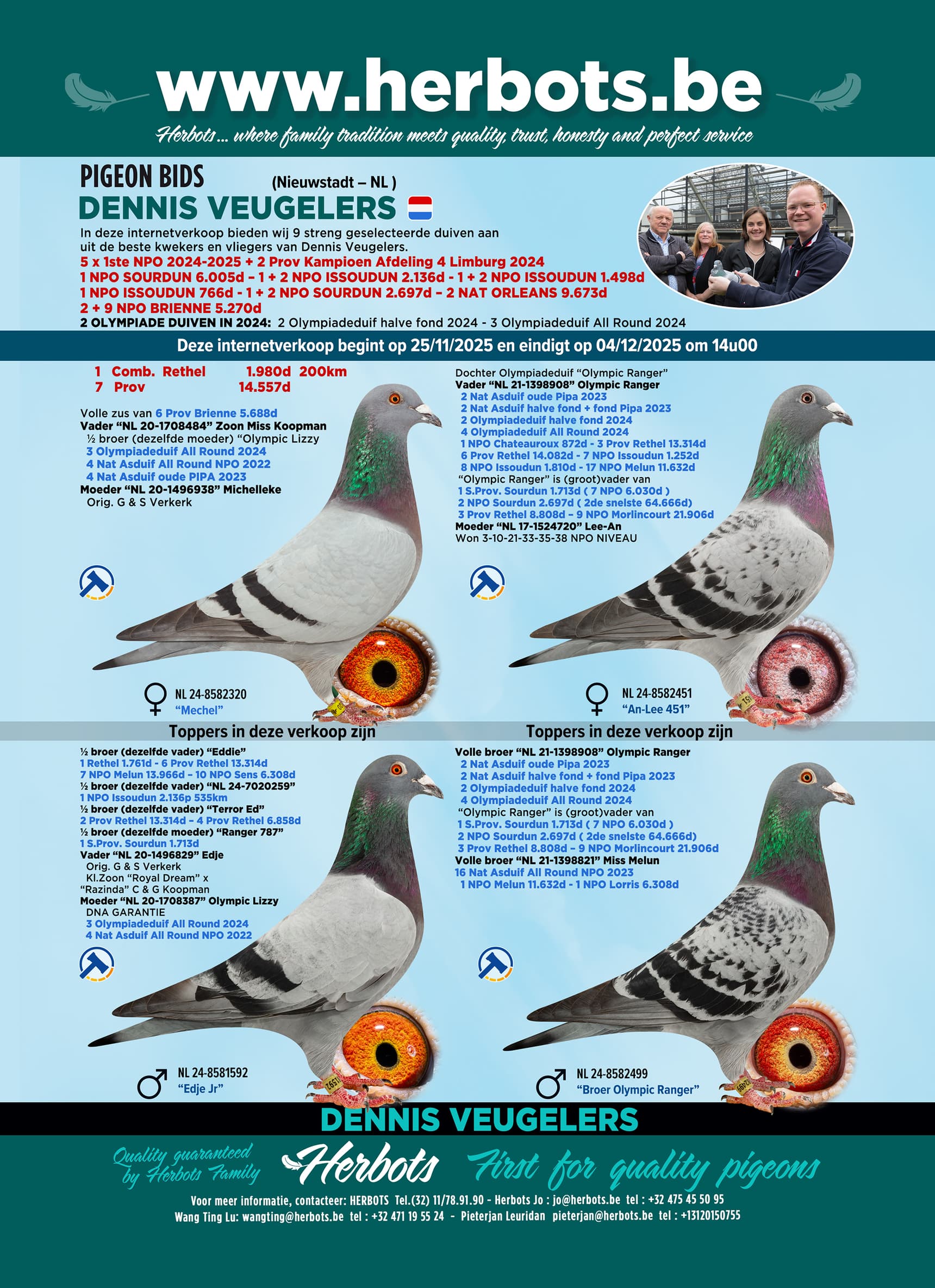 In deze internetverkoop bieden wij 9 streng geselecteerde duiven aan uit de beste kwekers en vliegers van Dennis Veugelers.