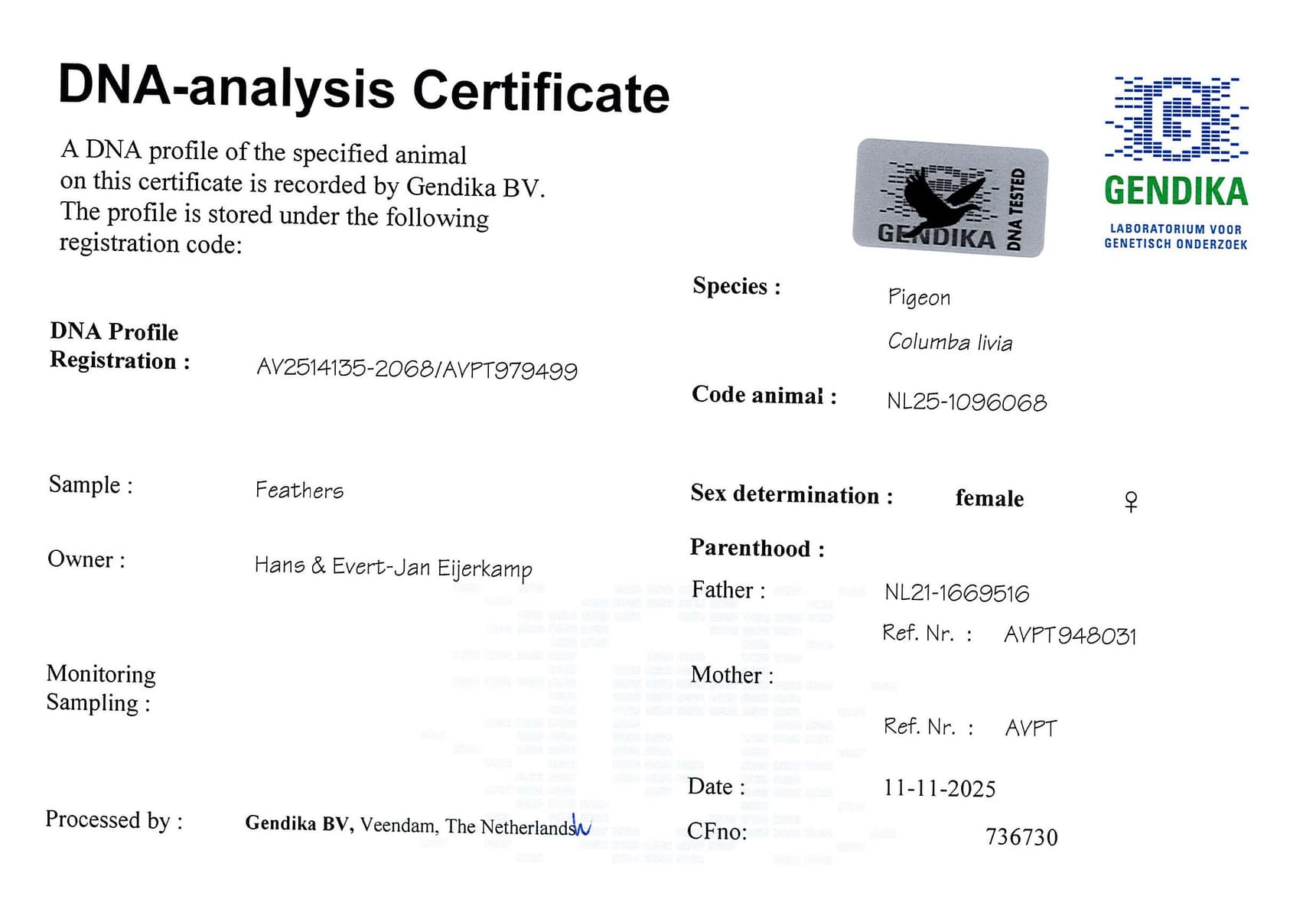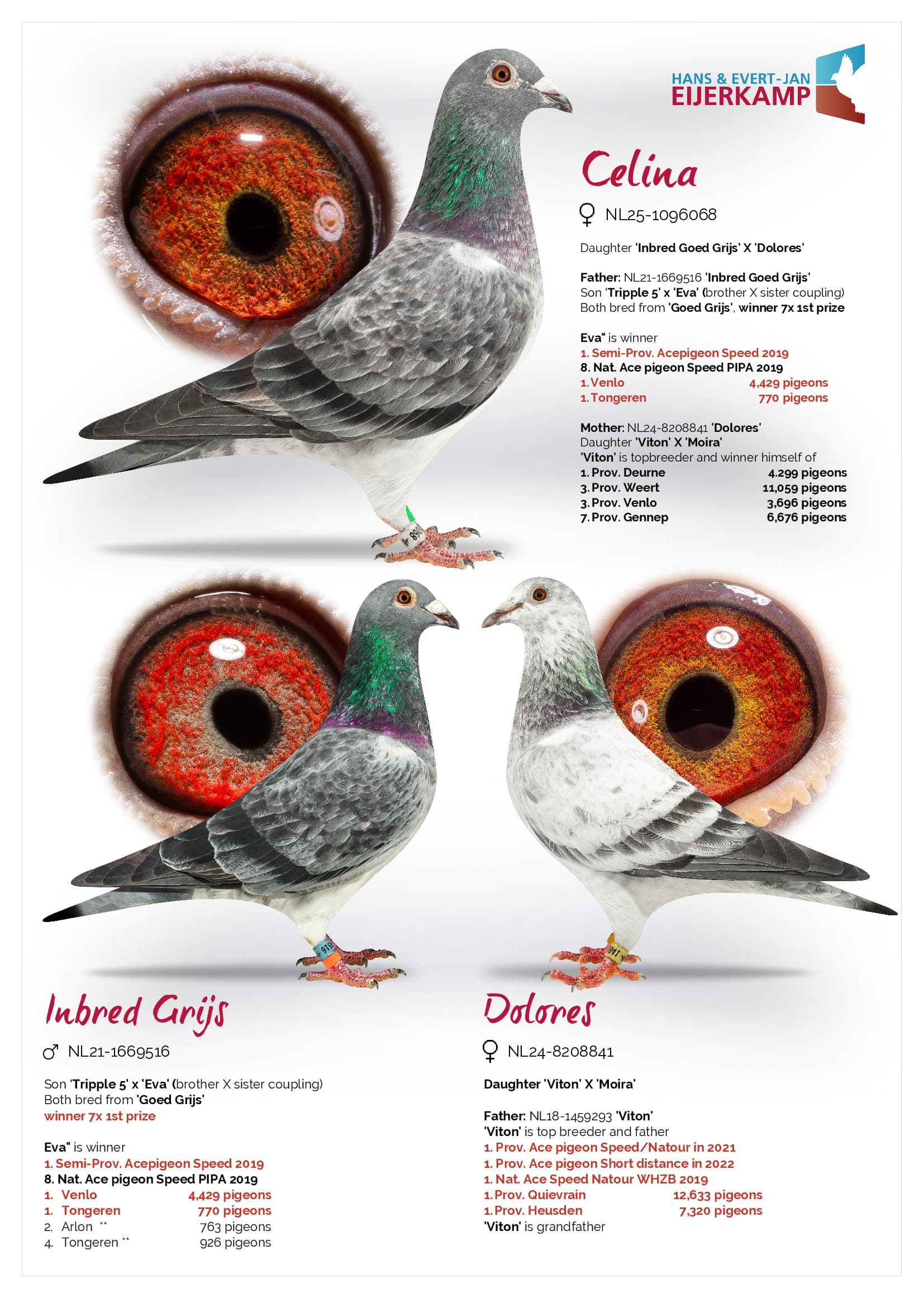Born out “Triple 5” (son “Goed Grijs”) x “Eva” (4th Nat. ace NPO short distance 2019 – descendants are winning 1st Olympiad bird Cat. G. 2023 – 1st Nat. ace middle distance World Best Pigeon ’23 – 2nd Nat. ace youngbirds Pipa Ranking)
