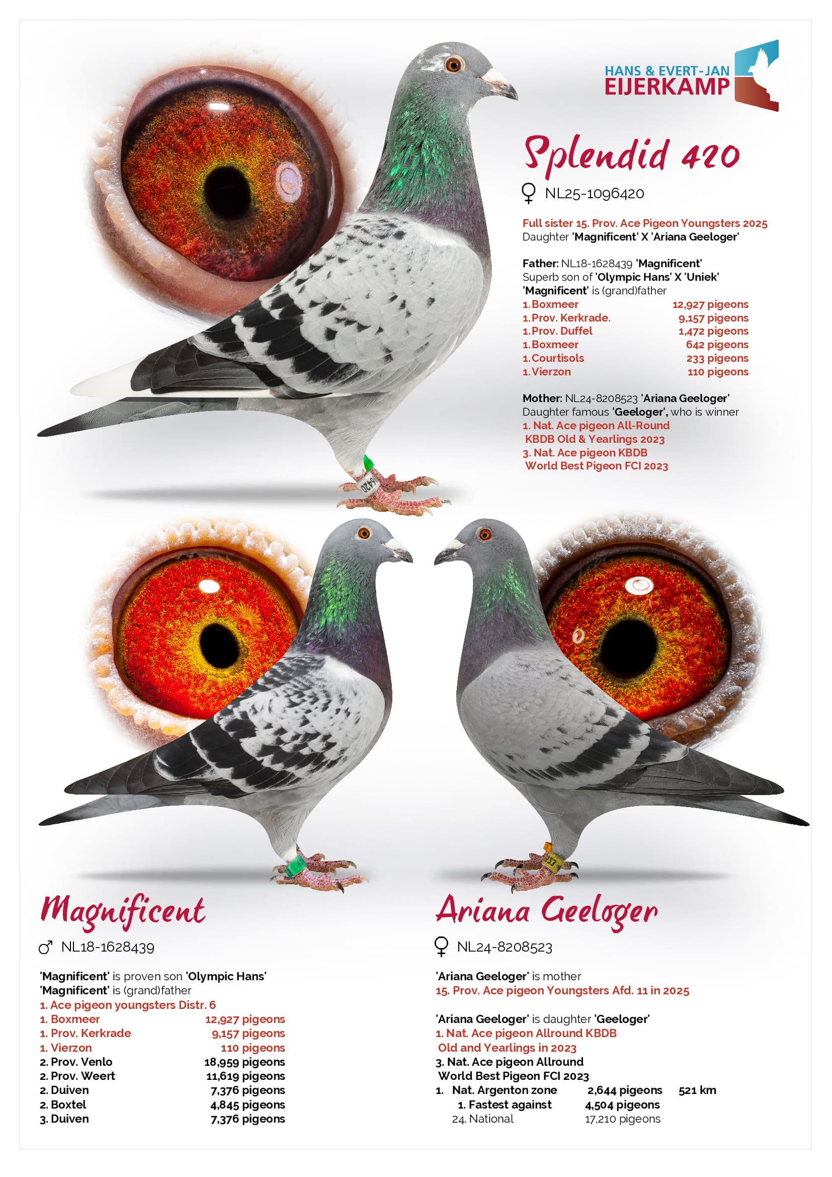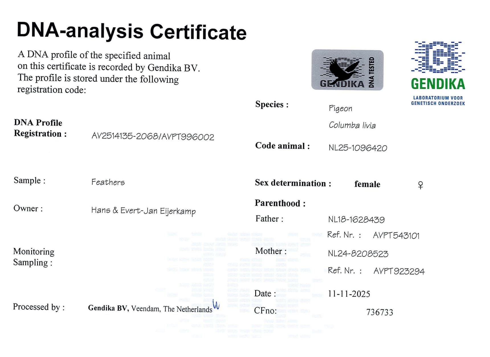 Born out “Olympic Hans” (Olympiad bird Allround Brussels) x “Uniek” (mother 1st Nat. ace yearbirds De Allerbeste 2019)