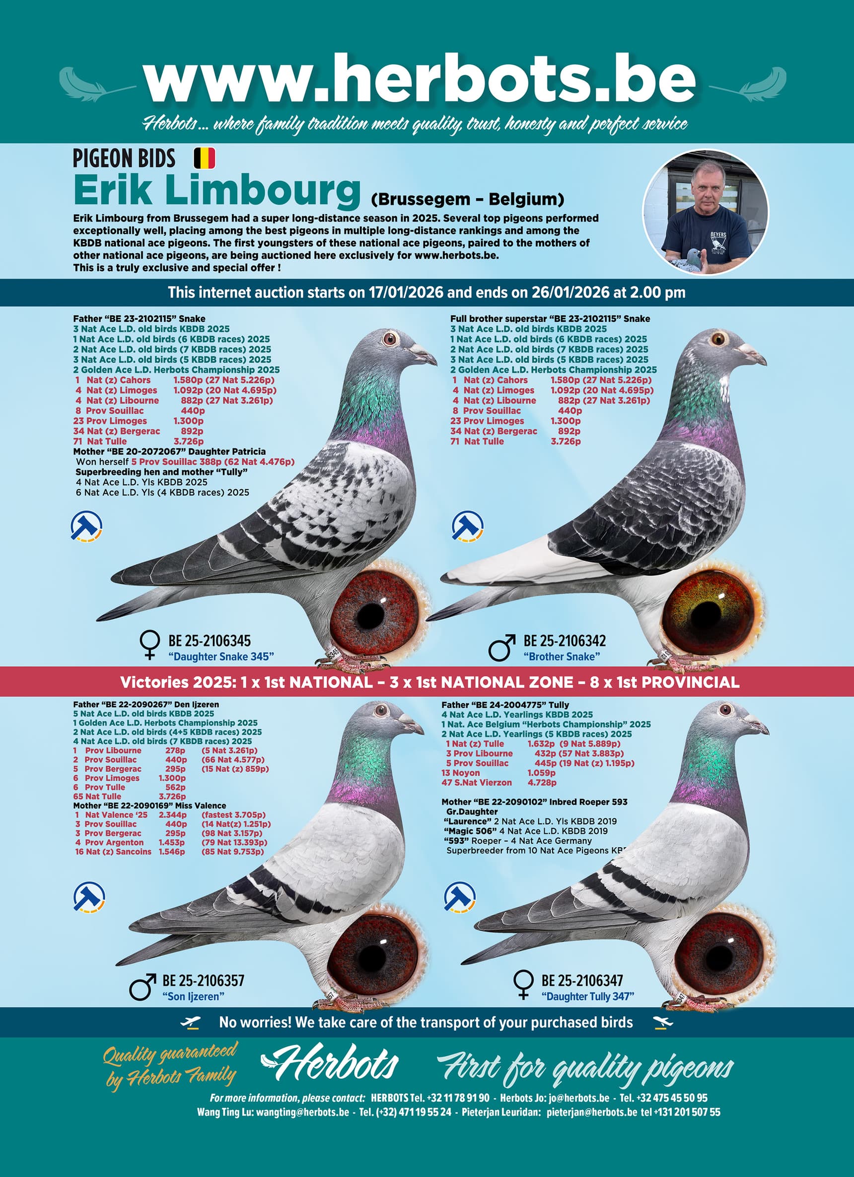Erik Limbourg uit Brussegem beleefde in 2025 een superseizoen op de fond. Meeredere toppers vlogen de pannen van het dak en zetten zich tussen de beste duiven in meerdere rankings op de fond en tussen de nationale asduiven KBDB. Speciaal en exclusief voor www.herbots.be komen hier de eerste kinderen van deze nationale asduiven in veiling die gekoppeld werden aan moeders van andere nationale asduiven. Iets heel exclusief en speciaal !!!