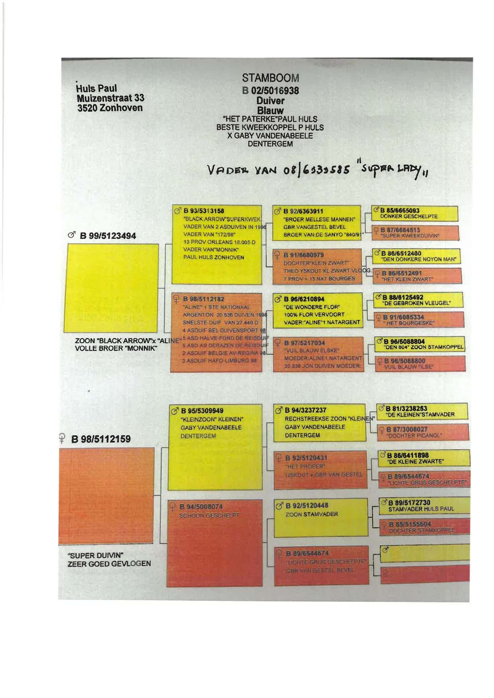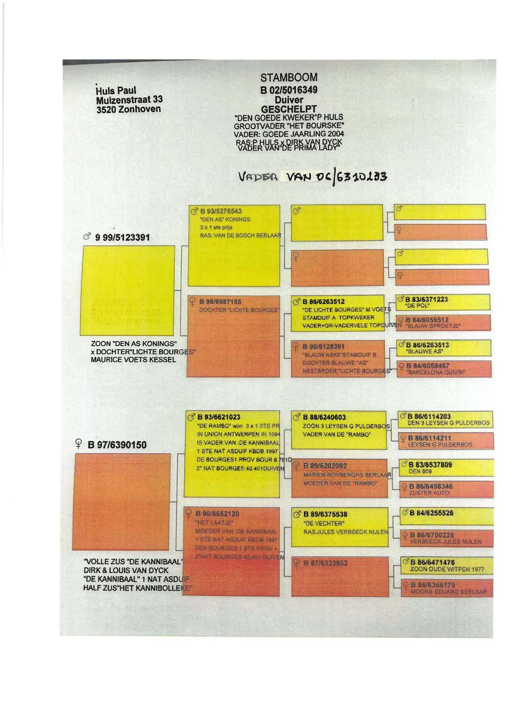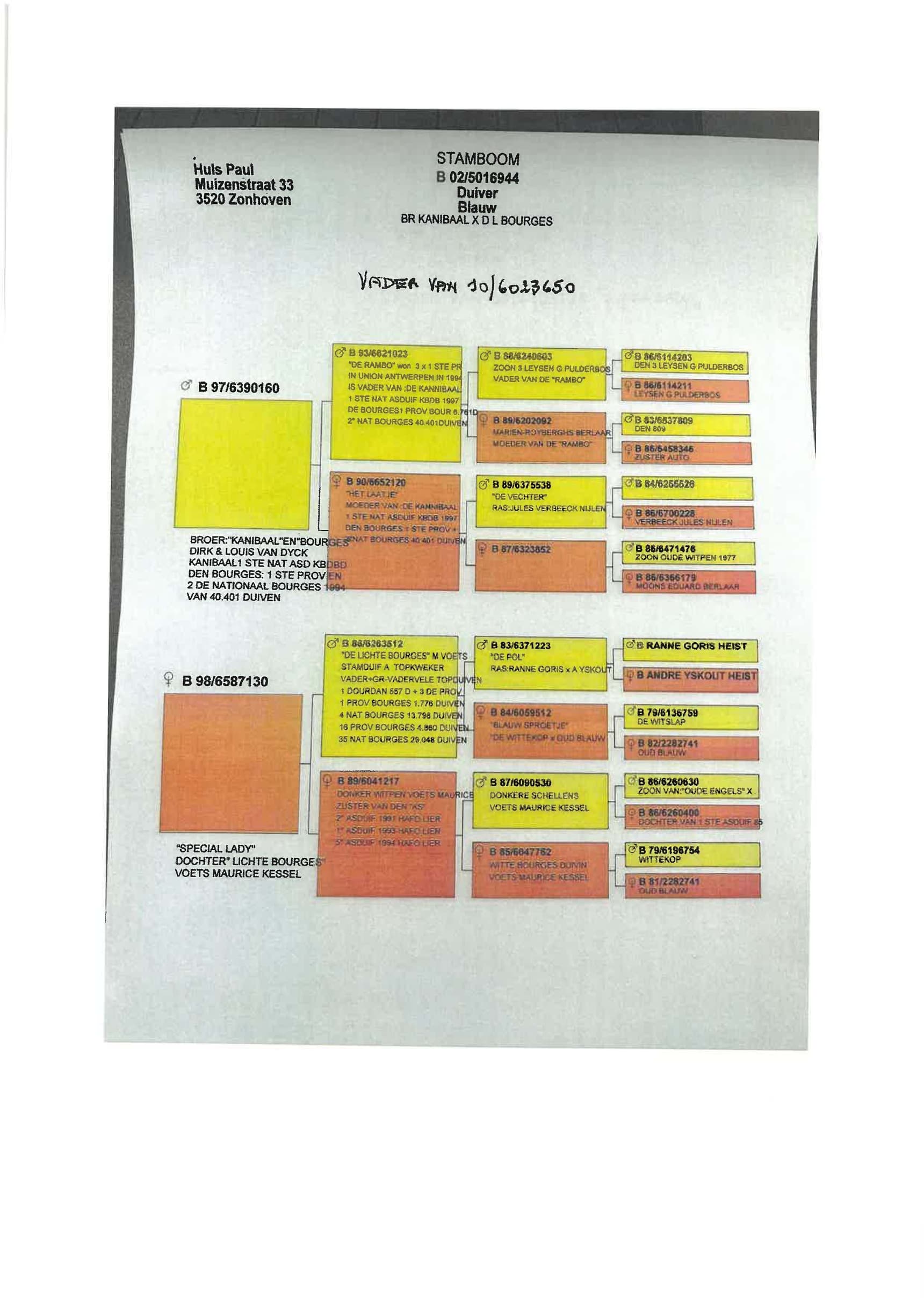 Breeding line: Tournier x Gaby Vandenabeele x Van Dyck ("Kannibaal") x Schellens ("lichte Bourges" - Voets) : via Paul Huls (see pedigrees)