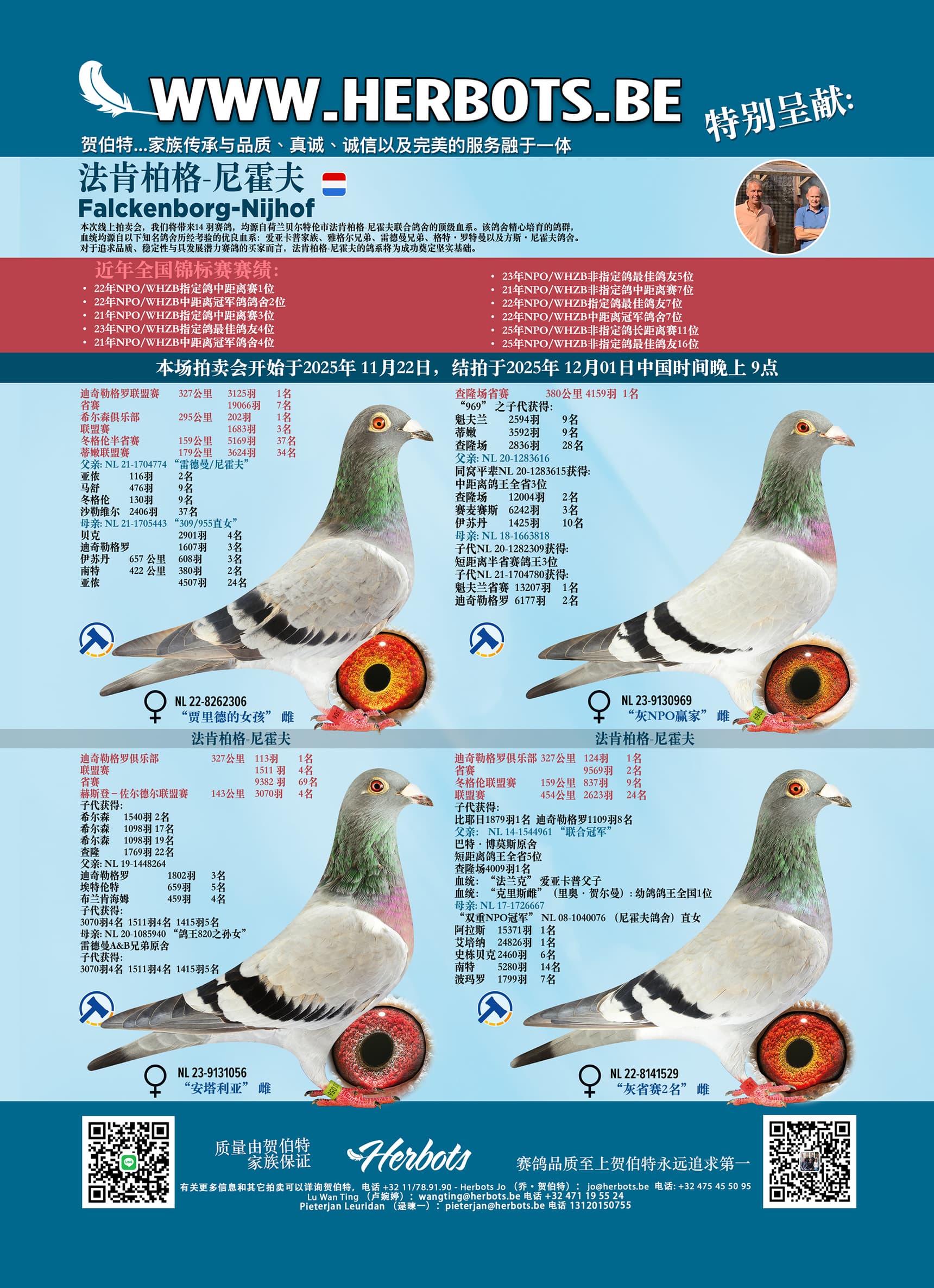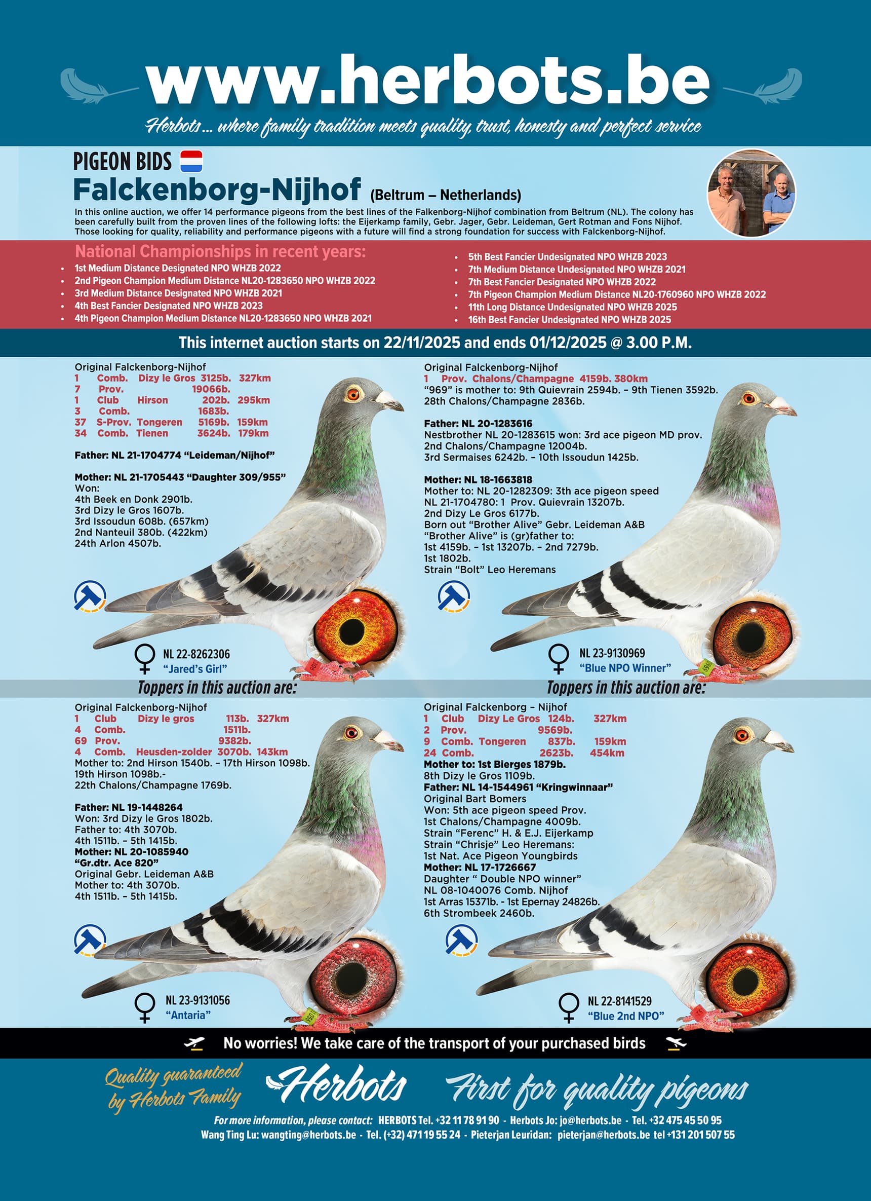 In deze online veiling bieden wij 14 prestatieduiven aan uit de beste lijnen van de combinatie Falkenborg-Nijhof uit Beltrum (NL). De kolonie is zorgvuldig opgebouwd uit de bewezen lijnen van de volgende hokken: de familie Eijerkamp, Gebr. Jager, Gebr. Leideman, Gert Rotman en Fons Nijhof. Wie op zoek is naar kwaliteit, betrouwbaarheid en prestatiegerichte duiven met toekomst, vindt bij Falckenborg-Nijhof een sterke basis voor succes.