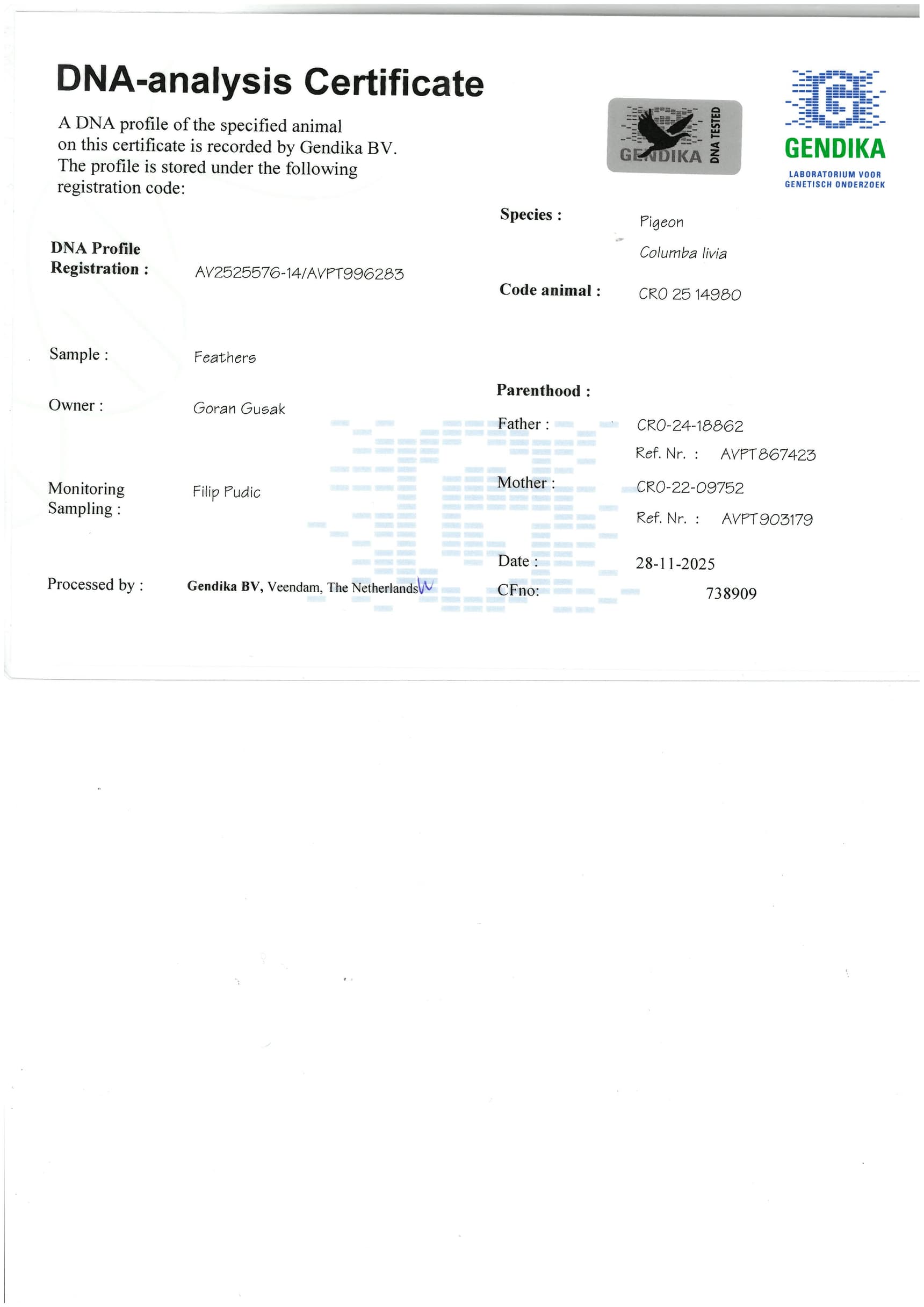 “DV13-1274491” (daughter Olympiad bird “Der 16”)