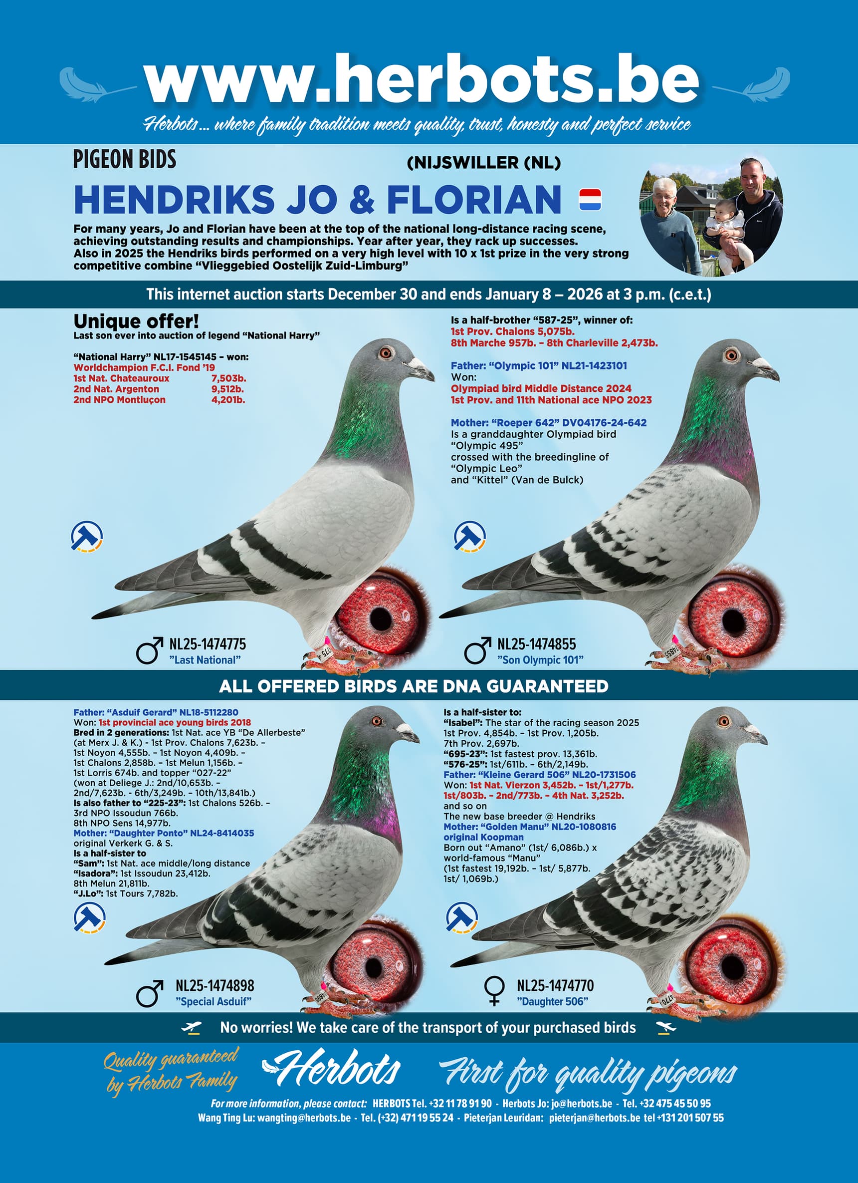 In deze editie van Pigeon Bids bieden Jo & Florian rechtstreekse kinderen uit hun volgende beroemde kwekers aan: "National Harry", "Kleine Gerard 506", "Golden Manu", "Son 081", "Olympic 101", "Asduif Gerard" and "Bully Harry"