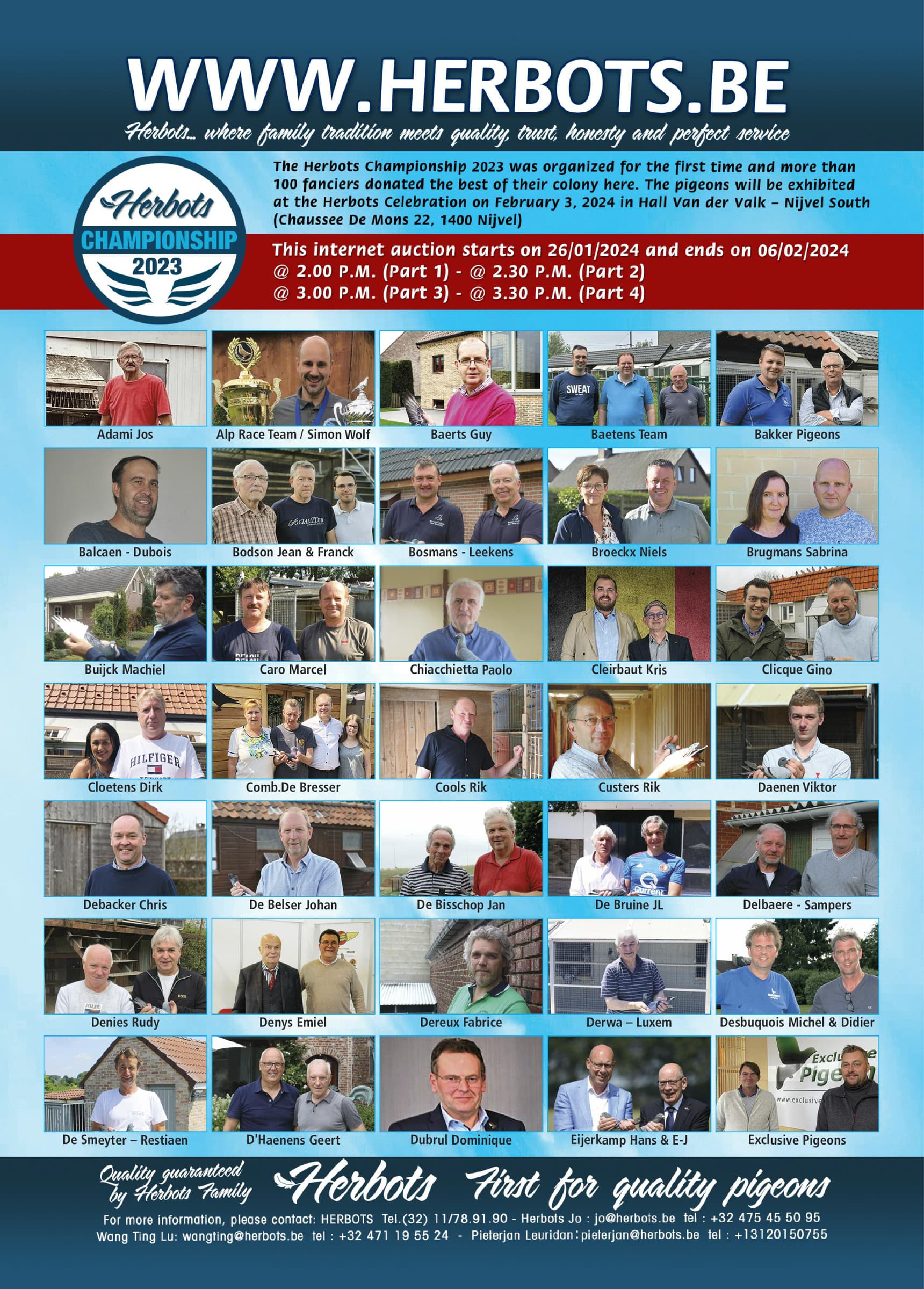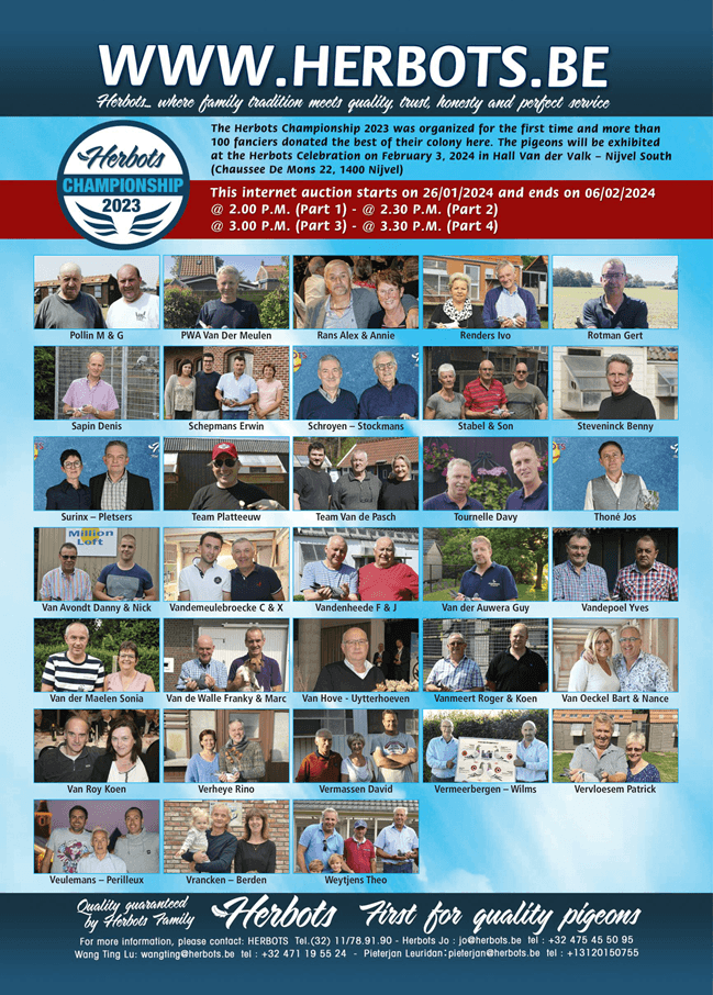 De duiven worden tentoongesteld op de Herbots Celebration op 3 februari 2024 in Hall Van der Valk – Nijvel Zuid (Chaussee De Mons 22, 1400 Nijvel)