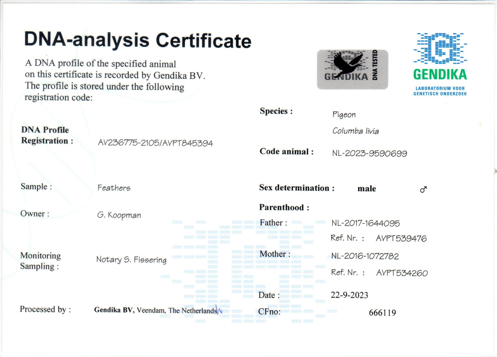 Direct daughter “Bjarne” (base breeding cock - original De Rauw-Sablon. Son out “Den Dromer”) x “Peiren 536” (original Noël Peiren – champion breeding hen)