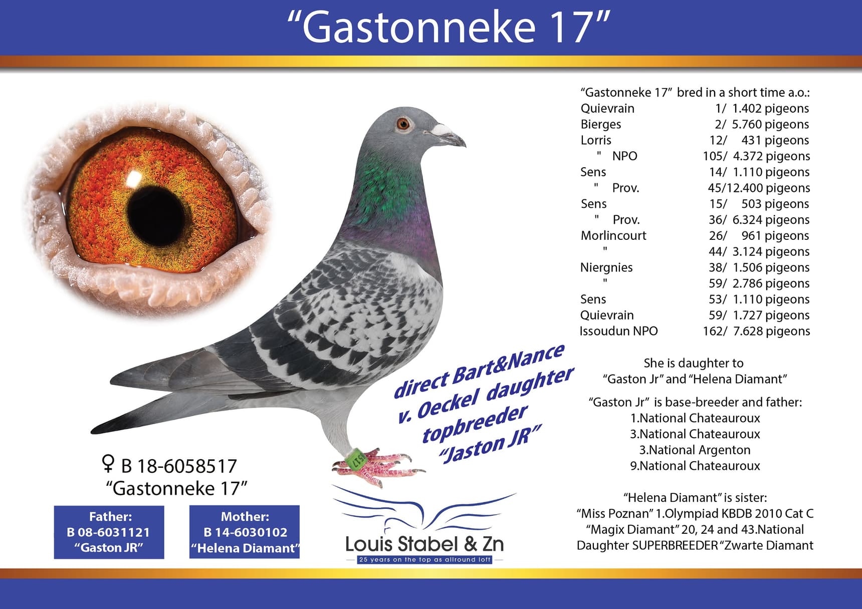 Direct daughter to super racer & breeder “Gaston Jr” Bart&Nance Van Oeckel