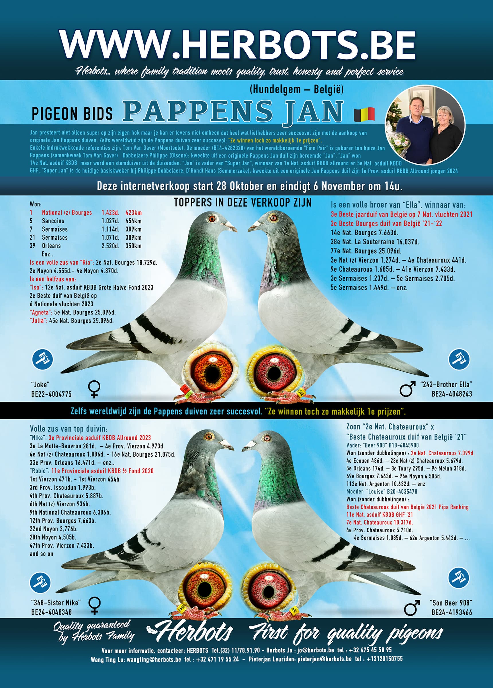 Jan presteert niet alleen super op zijn eigen hok maar je kan er tevens niet omheen dat heel wat liefhebbers zeer succesvol zijn met de aankoop van originele Jan Pappens duiven. Zelfs wereldwijd zijn de Pappens duiven zeer succesvol. “Ze winnen toch zo makkelijk 1e prijzen”.