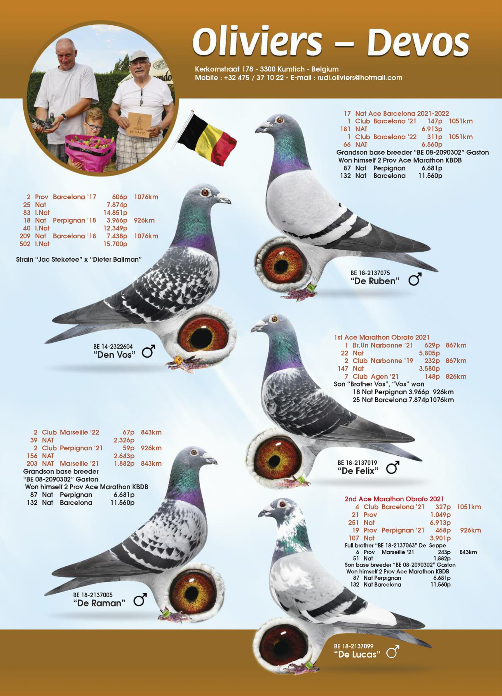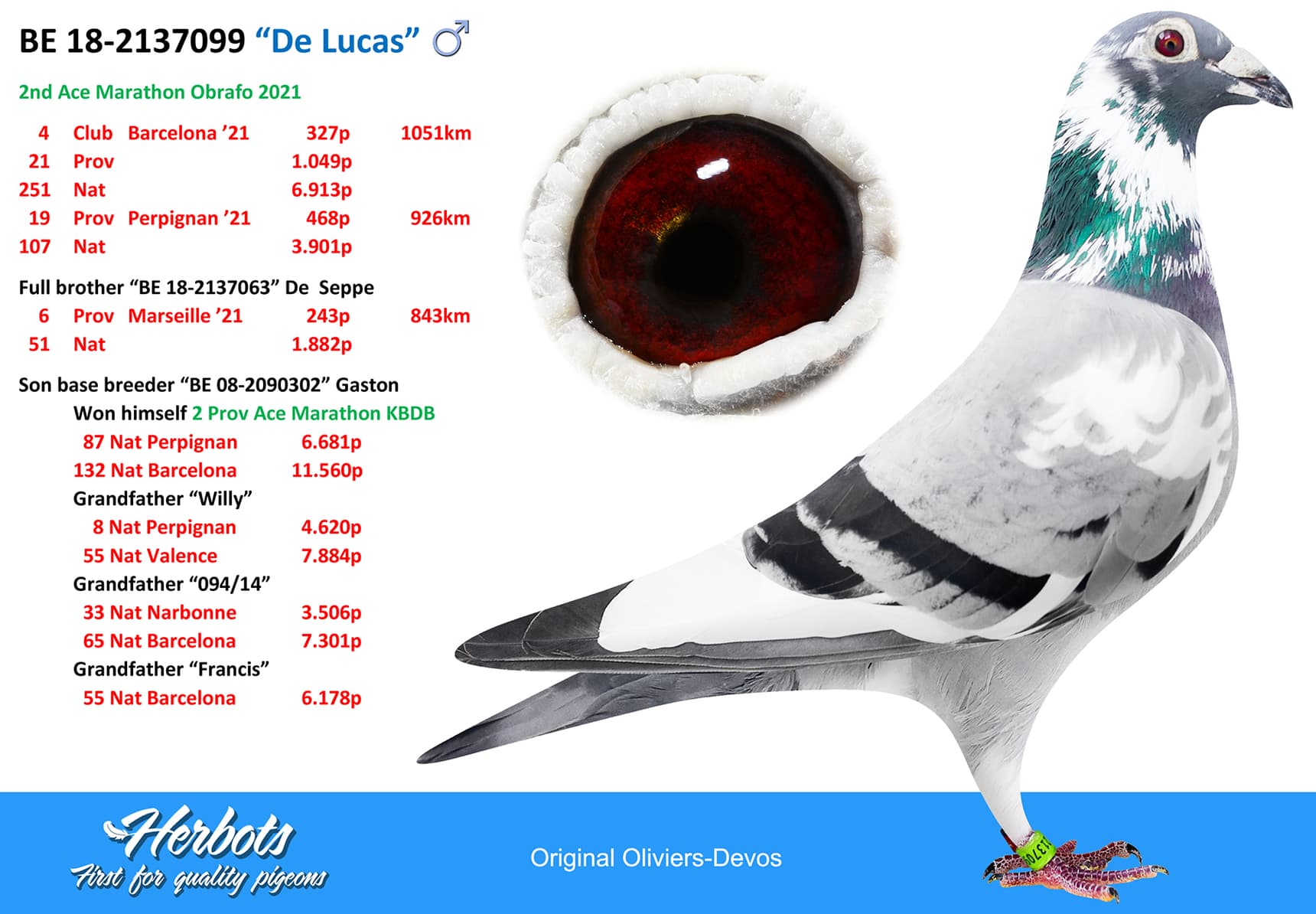 Born out “B08-2090302” (won 2nd Perpignan 293b. – original Eric Herbots) x “B16-2310180” (half-sister to 1st Chateauroux – 1st Agen)