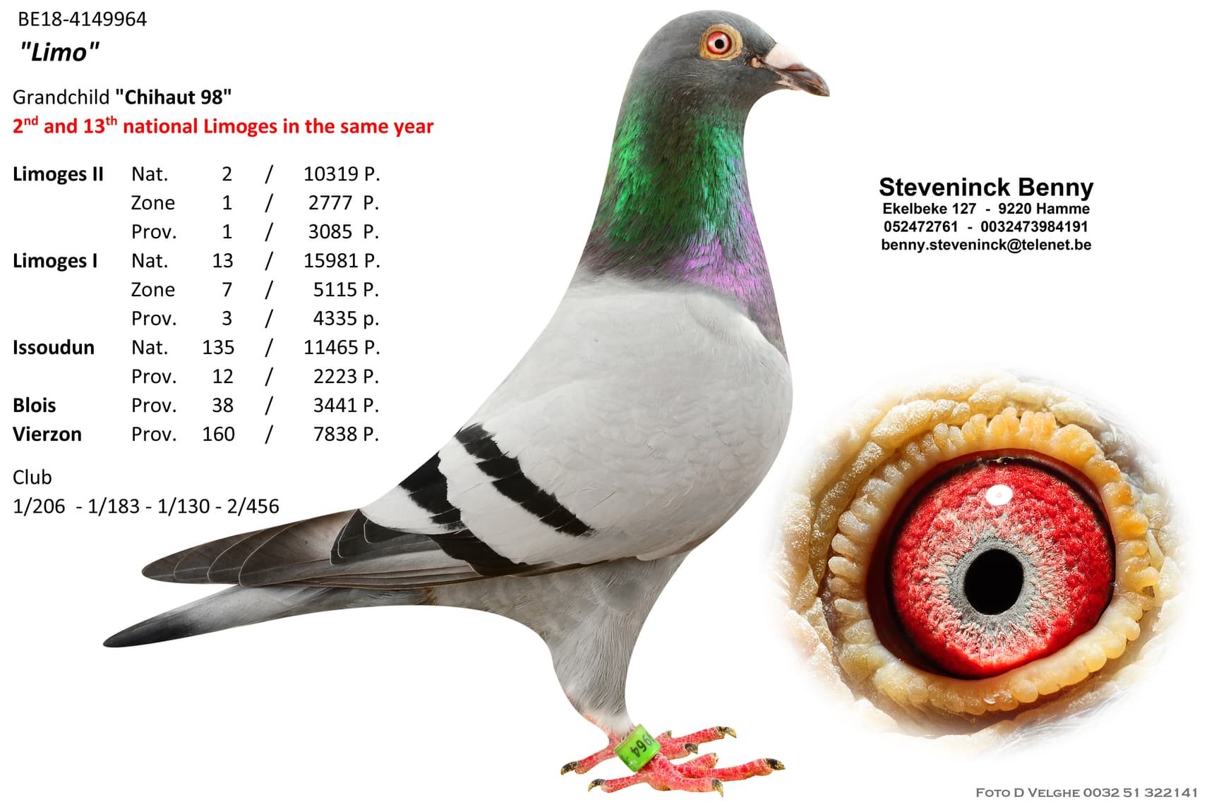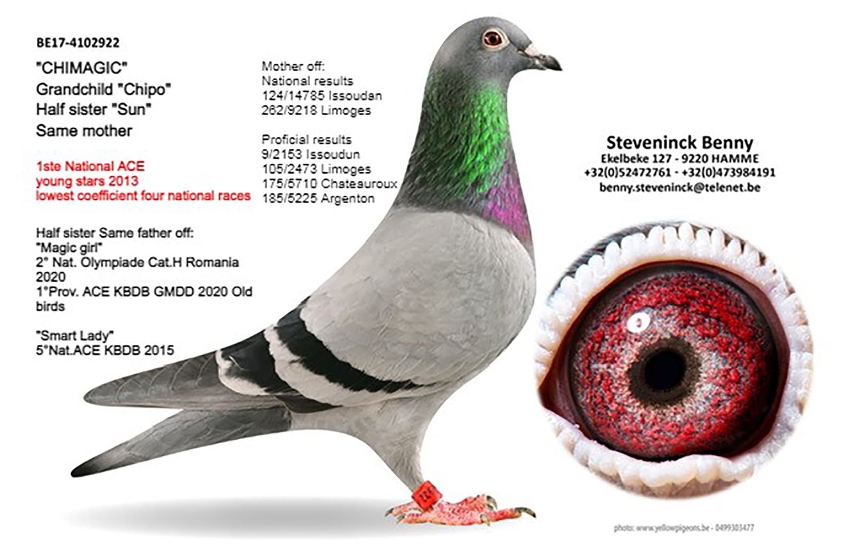 Direct son “Lucky 14” (won 36th Nat. Montluçon 11,056b. - 63rd Nat. Chateauroux 18,604b. – 94th Nat. Argenton 3,671b. – 110th Nat. Montluçon 14,230b. – direct son 3rd Nat. ace KBDB ½ Fond “Chihaut 98”) x “National Breeder” (mother to 2nd, 2nd, 12th, 13th, 17th, 25th National winners)