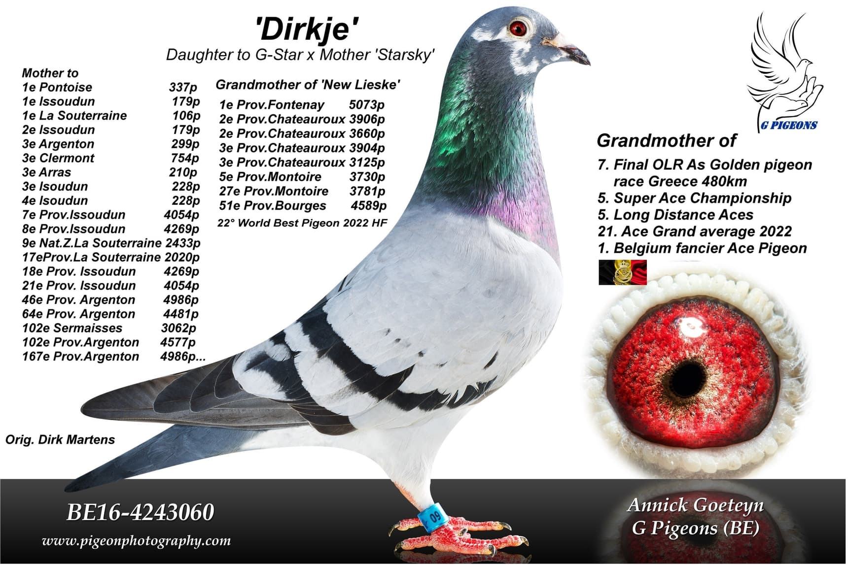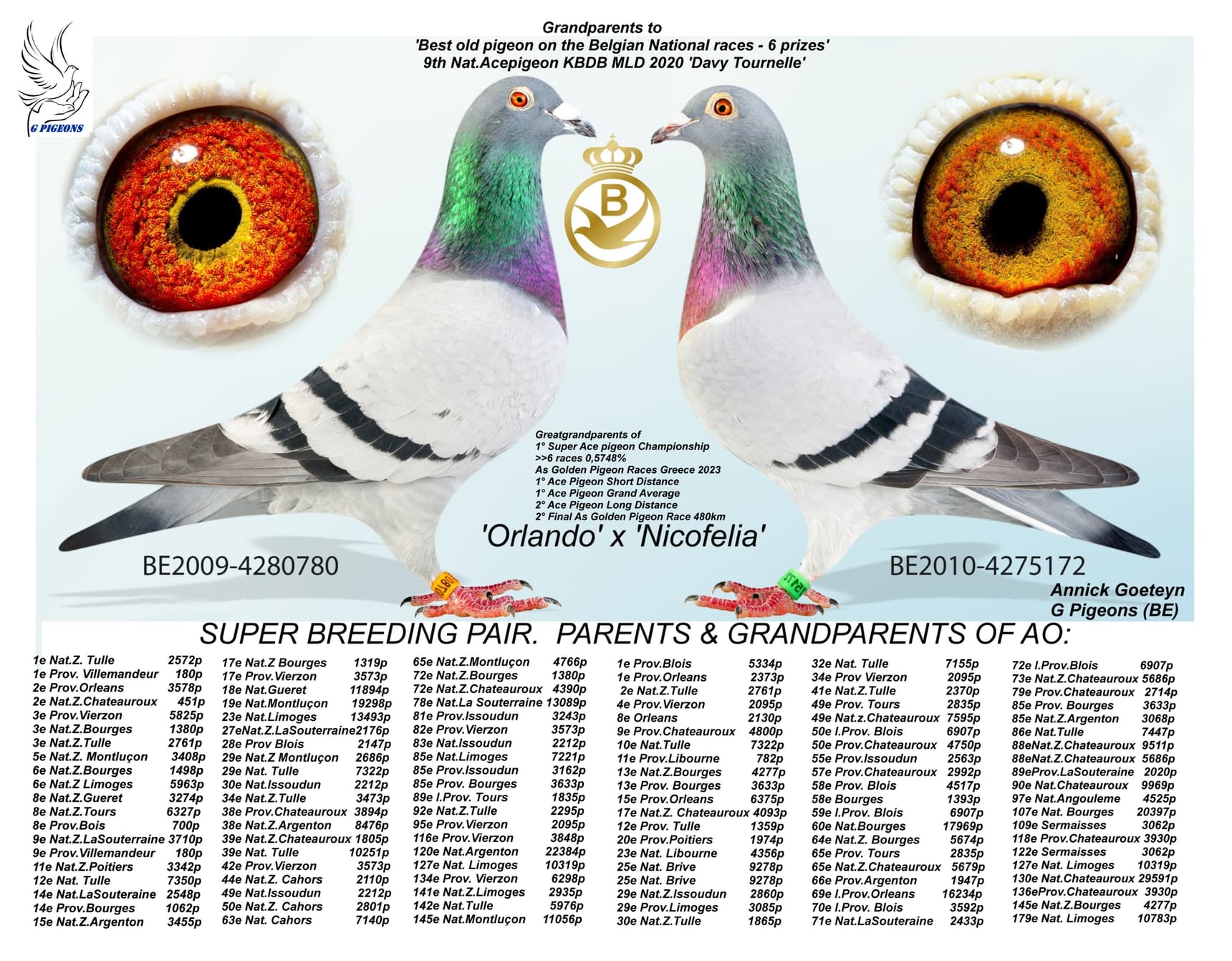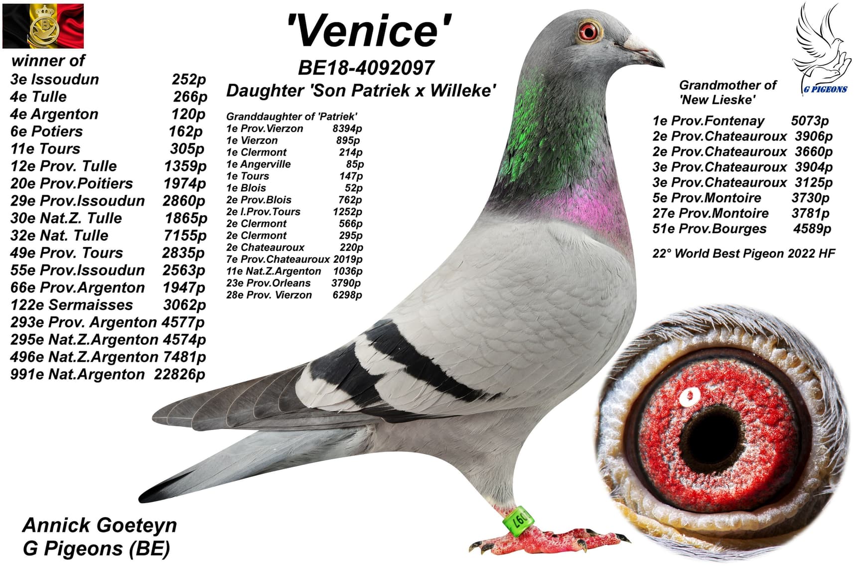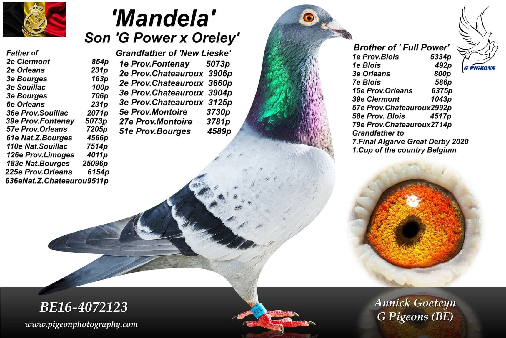 Direct daughter “Mandela” (son “G-Power” x “Oreley”) x “Venice” (winner of: 3rd Issoudun 252b. – 29th Prov. 2,860b. - 32nd Nat. Tulle 7,155b. – 49th Prov. Tours 2,835b. – 55th Prov. Issoudun 2,563b. – 66th Prov. Argenton 1,947b.)