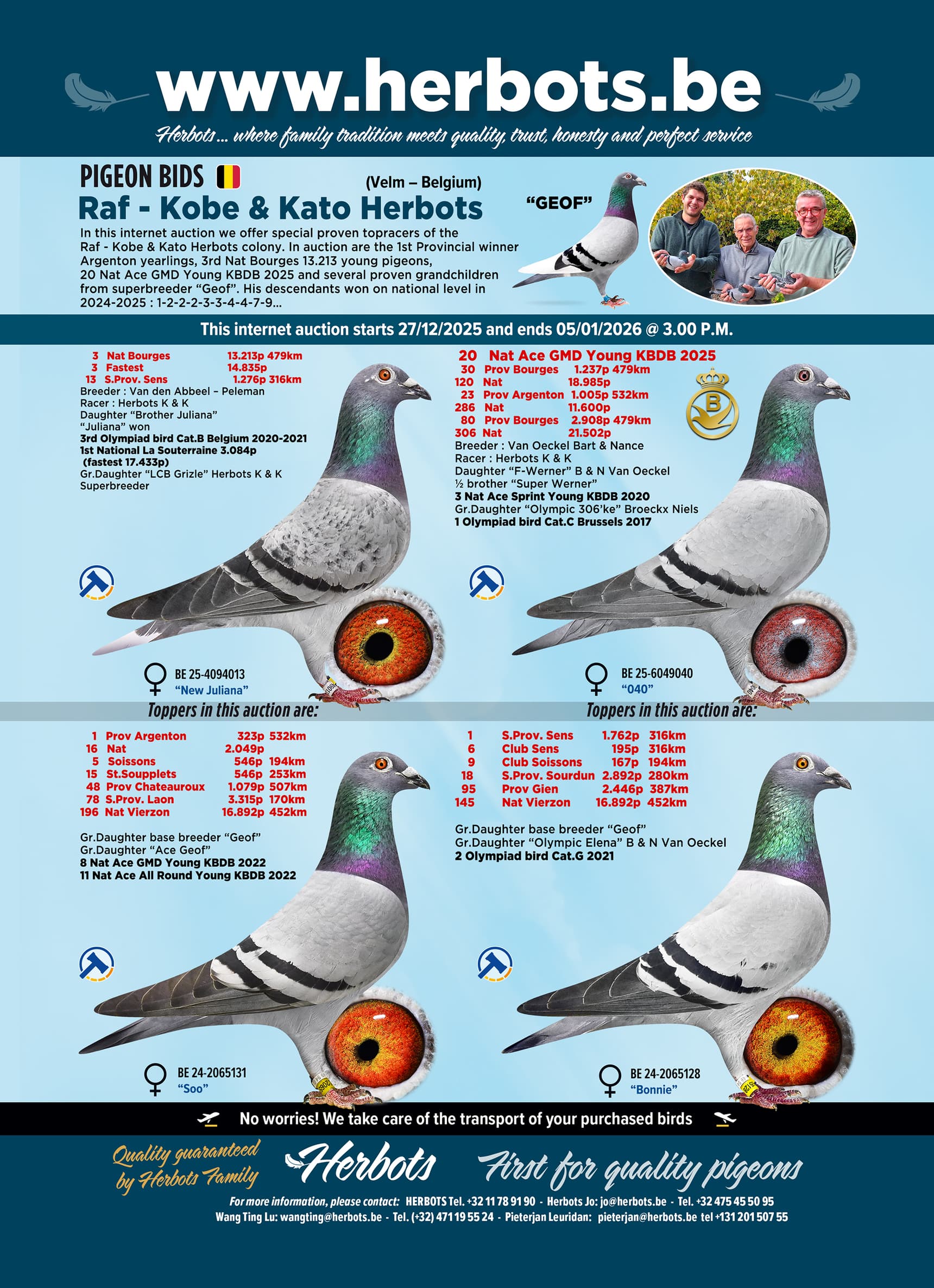 In deze internetveiling bieden we bijzondere bewezen topvliegers aan van de kolonie Raf - Kobe & Kato Herbots. In de veiling zijn de 1ste Provinciale winnaar Argenton jaarlingen, 3de Nat Bourges 13.213 jonge duiven, 20e Nat Asduif Zware Halve Fond Jonge KBDB 2025 en diverse bewezen kleinkinderen van superkweker “Geof”. Zijn nakomelingen wonnen op nationaal niveau in 2024-2025: 1-2-2-2-3-3-4-4-7-9…