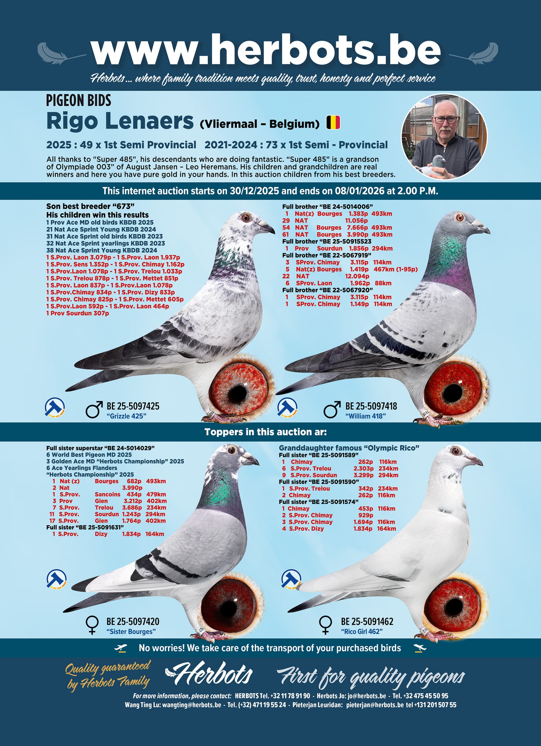 "Super 485" is een kleinzoon van Olympiade 003" van August Jansen – Leo Heremans. Zijn kinderen en kleinkinderen zijn echte toppers en hier heeft u puur goud in handen.