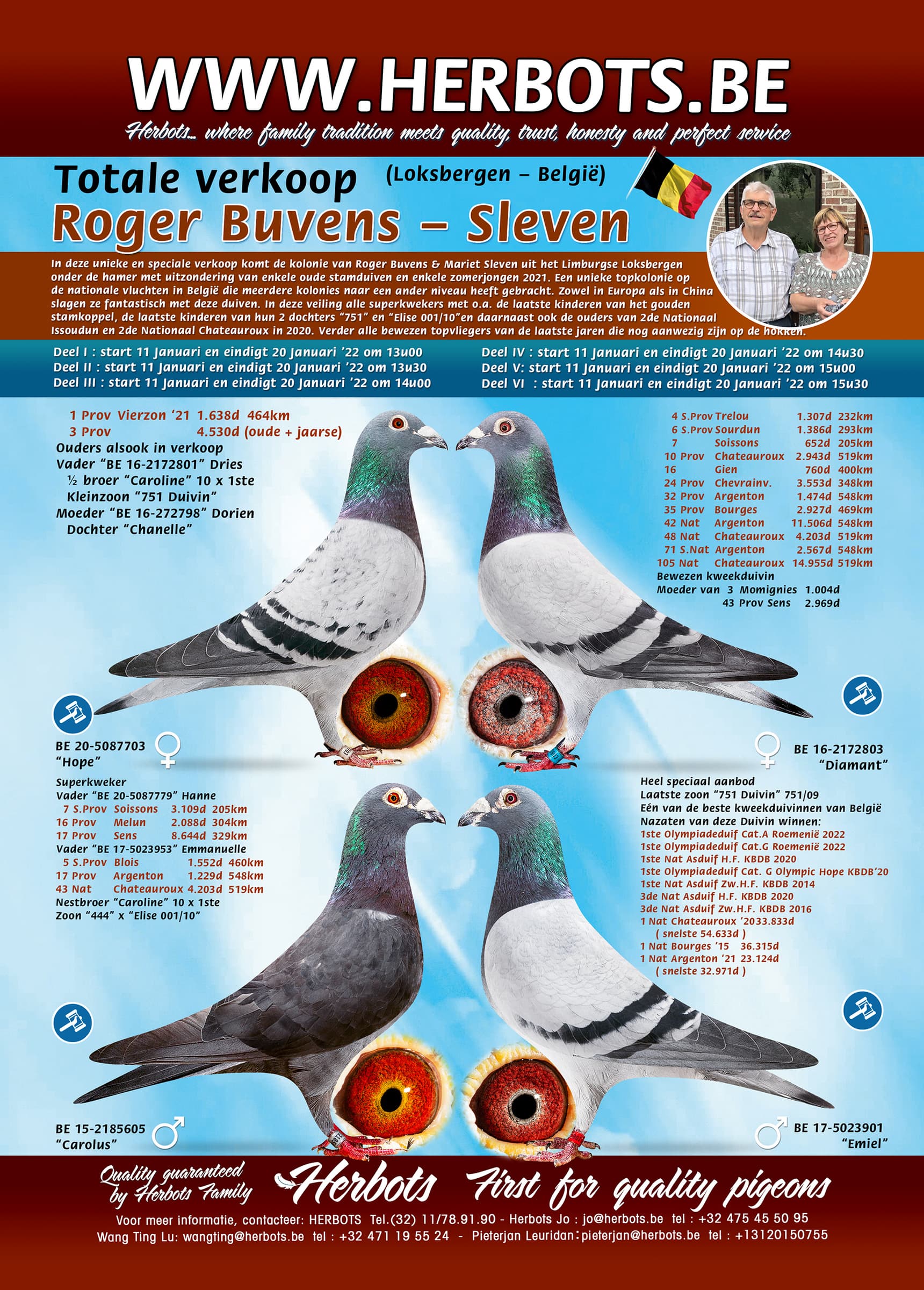 In deze unieke en speciale verkoop komt de kolonie van Roger Buvens & Mariet Sleven uit het Limburgse Loksbergen onder de hamer met uitzondering van enkele oude stamduiven en enkele zomerjongen 2021. Een unieke topkolonie op de nationale vluchten in België die meerdere kolonies naar een ander niveau heeft gebracht. Zowel in Europa als in China slagen ze fantastisch met deze duiven. In deze veiling alle superkwekers met o.a. de laatste kinderen van het gouden stamkoppel, de laatste kinderen van hun 2 dochters “751” en “Elise 001/10”en daarnaast ook de ouders van 2de Nationaal Issoudun en 2de Nationaal Chateauroux in 2020. Verder alle bewezen topvliegers van de laatste jaren die nog aanwezig zijn op de hokken.