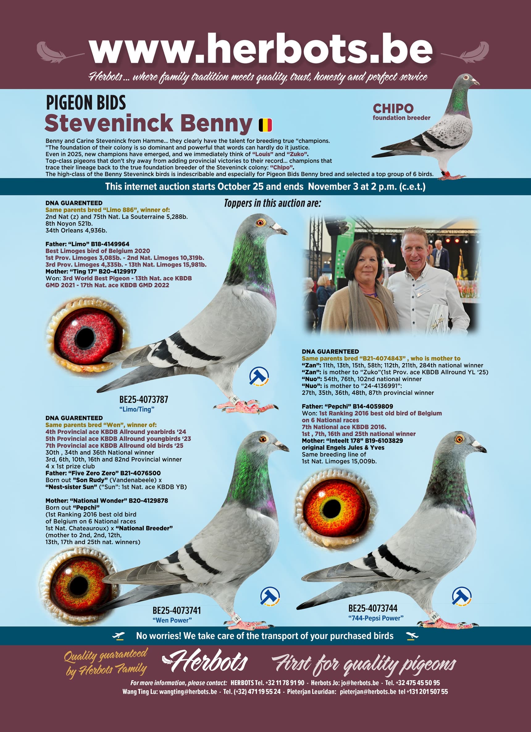 Benny en Carine Steveninck uit Hamme... ze hebben duidelijk de kunst om echte "crack duiven" te kweken in de vingers. De basis van hun kolonie is zo overheersend en sterk dat het bijna niet meer te verwoorden valt.
