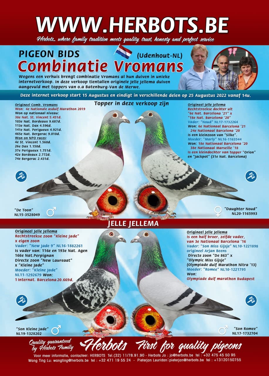 Wegens een verhuis brengt combinatie Vromans al hun duiven in unieke internetverkoop. In deze verkoop tientallen originele Jelle Jellema duiven aangevuld met toppers van o.a Batenburg-Van de Merwe