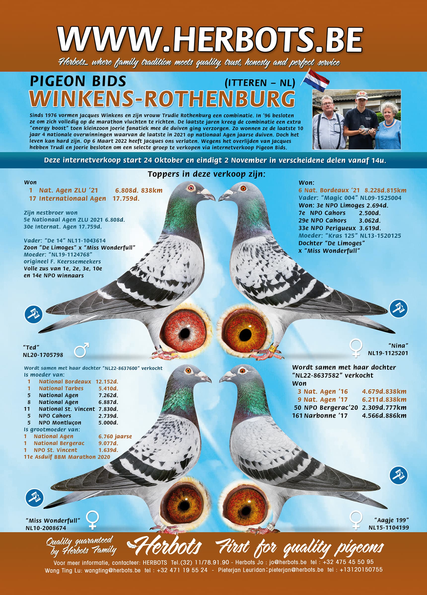 Sinds 1976 vormen Jacques Winkens en zijn vrouw Trudie Rothenburg een combinatie. In ’96 besloten ze om zich volledig op de marathon vluchten te richten. De laatste jaren kreeg de combinatie een extra “energy boost” toen kleinzoon Joerie fanatiek mee de duiven ging verzorgen. Zo wonnen ze de laatste 10 jaar 4 nationale overwinningen waarvan de laatste in 2021 op nationaal Agen jaarse duiven.