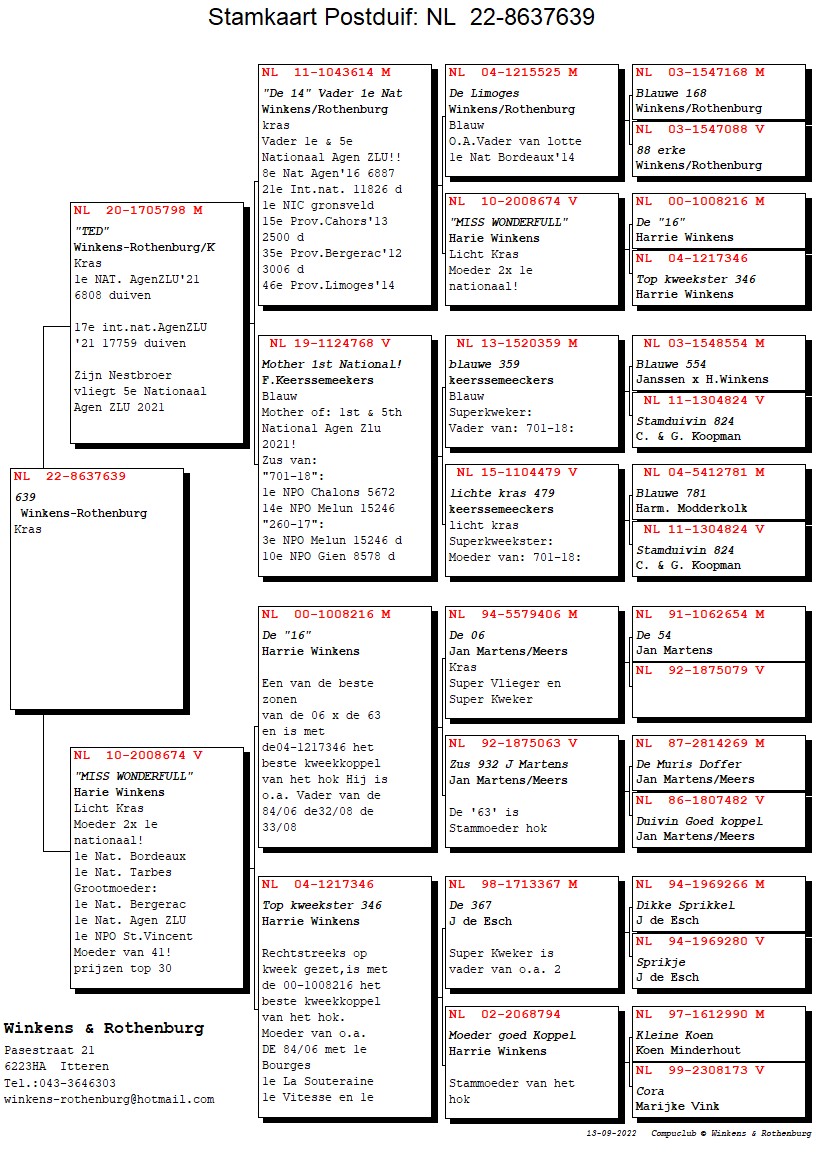 Born out “De 16” (Jan Meers via Harrie Winkens) x “NL04-1217346” (base breeding hen)