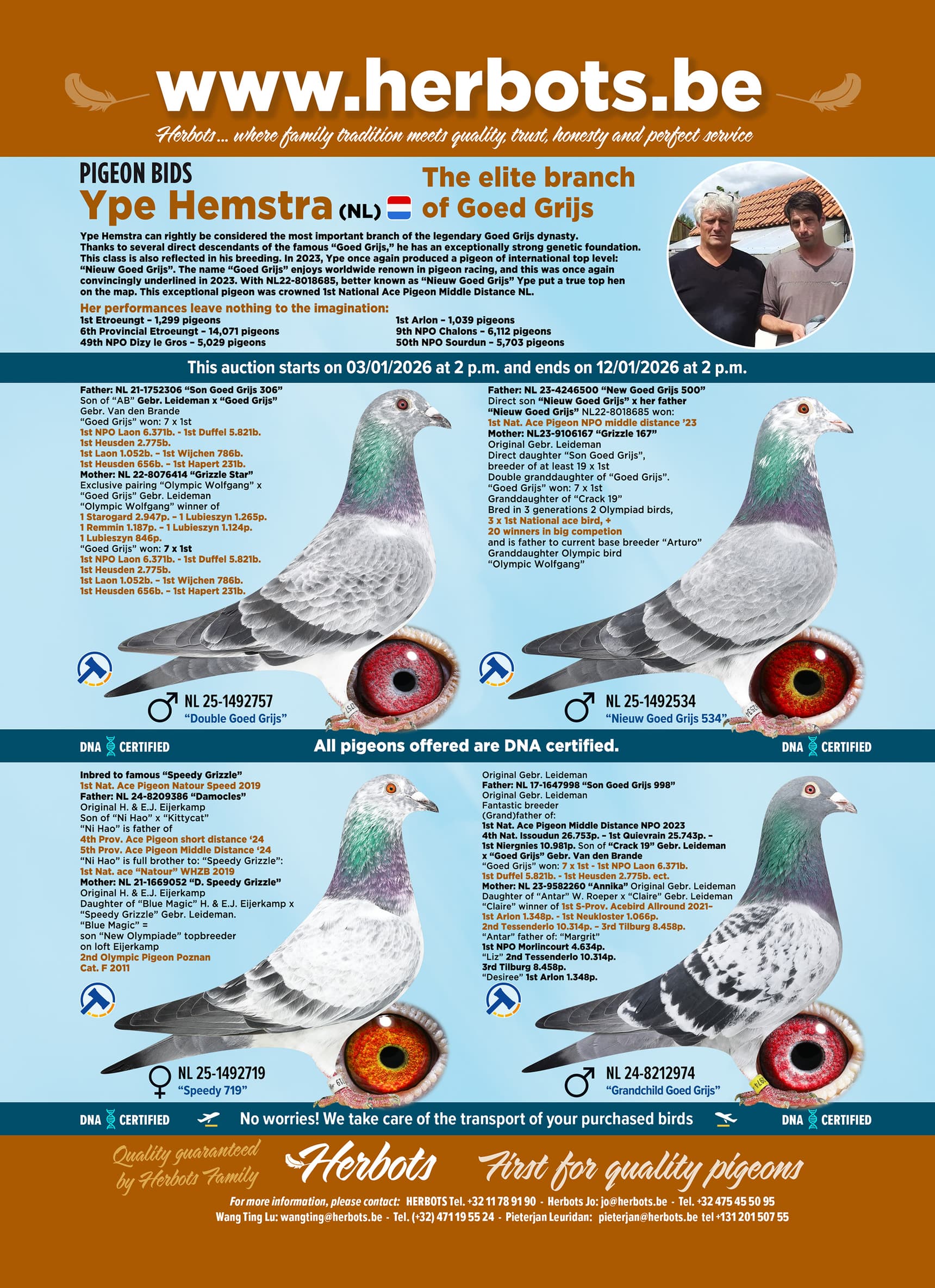 Speciaal voor Pigeon Bids heeft Ype een topgroep van duiven geselecteerd die verband houden met zijn huidige kampioenskwekers.