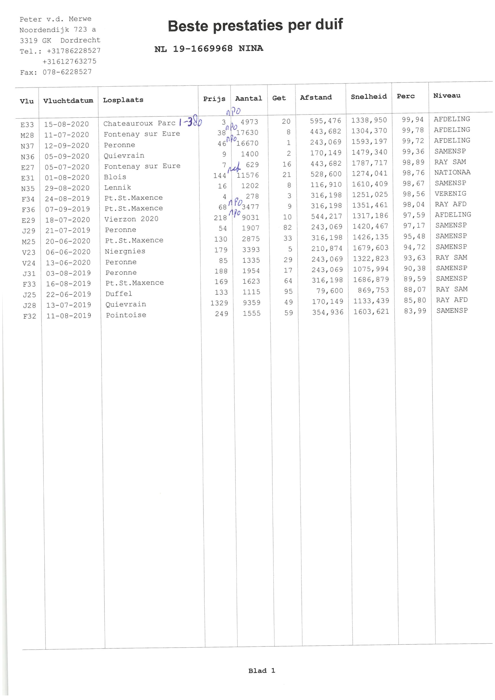 Peronne 2,247b.) x “Makke Bontje” (7th Nat. ace 2015)