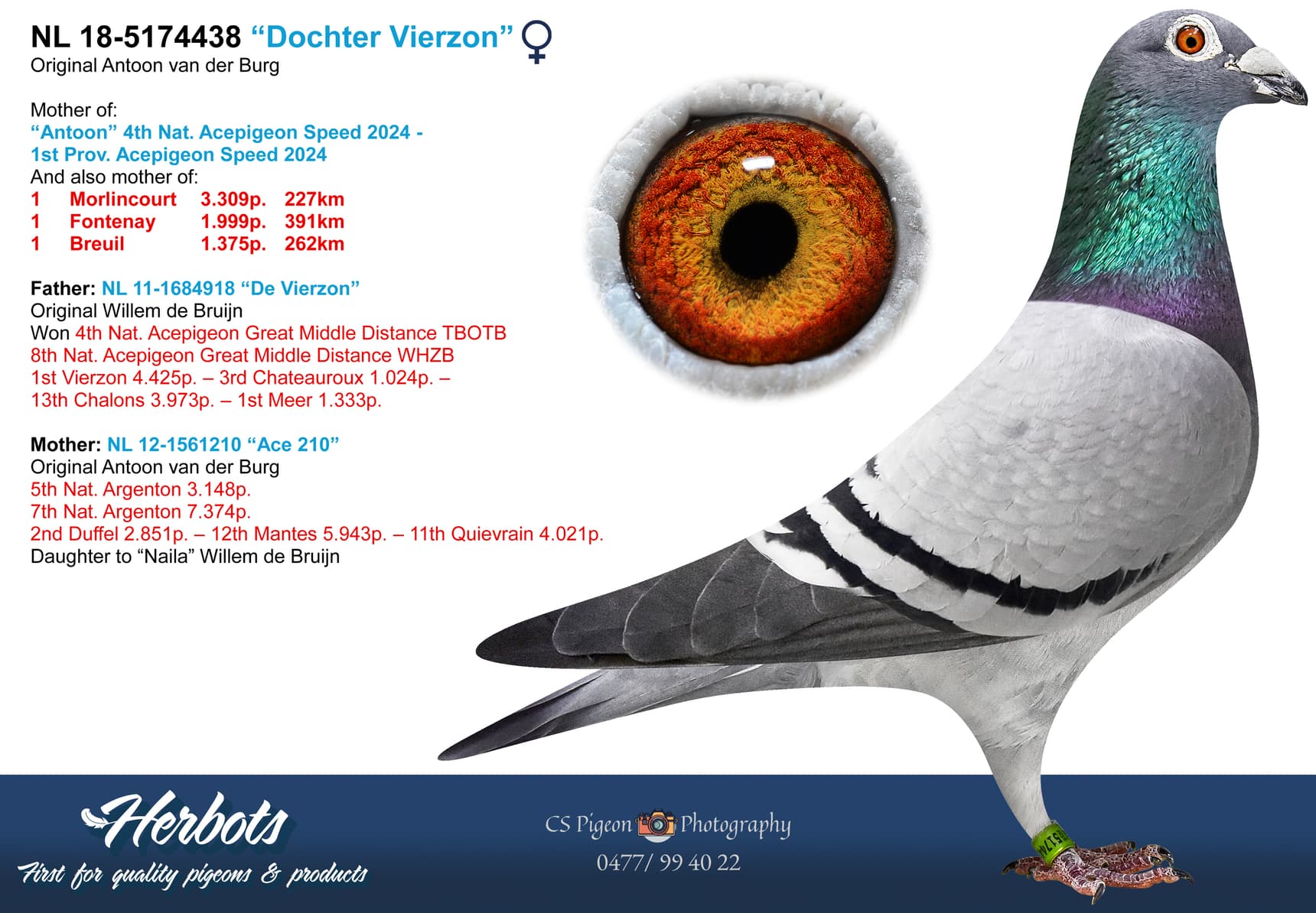 NL 24-2407410 “Fleur” Granddaughter “Redbull”:4th Nat. Acepigeon Speed 2025 - 1st Prov. Acepigeon Speed 2025
