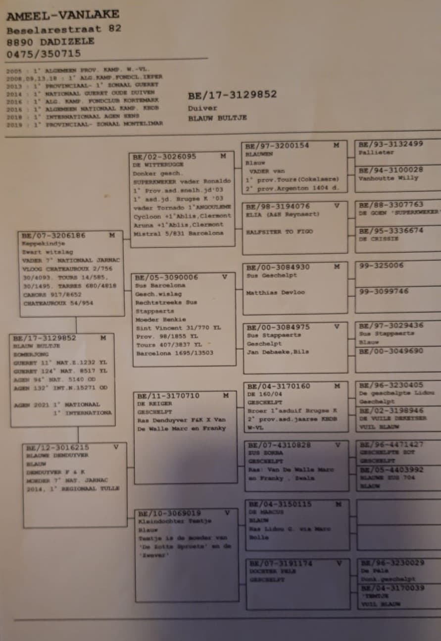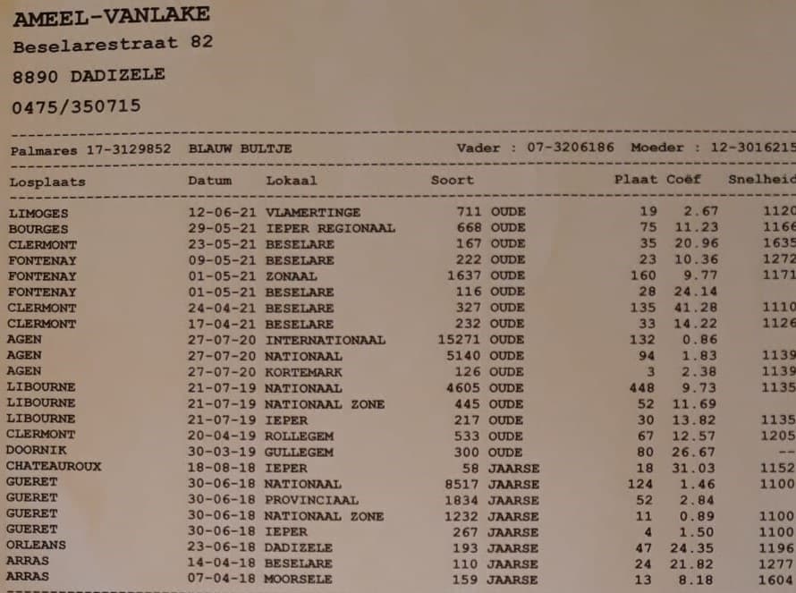 ‘Het Blauwe Bultje’ (BE17-3129852) succeeded in leaving 35,724 pigeons behind on a fair and nice race of 789 kilometers between Agen and Dadizele. Nationally it is the 1st prize against 6,939 old birds. This blue cock already proved being able to handle the extreme long distance, but can also do it on the greater middle distance.