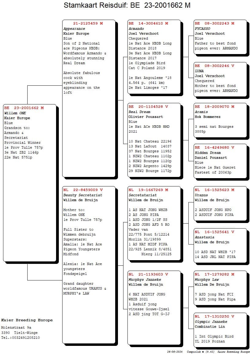 When scrutinising the pedigree, you immediately see that 'Willem One' is descended from absolute top pigeons. On his father's side, he is a grandson of 1st Nat. Ace pigeon Great Middle Distance KBDB 2021 'Real Dream' of Olivier Poussart coupled with the world famous pigeon 'Armando' of Joël Verschoot, an absolute top breeder who raced the following impressive palmares: