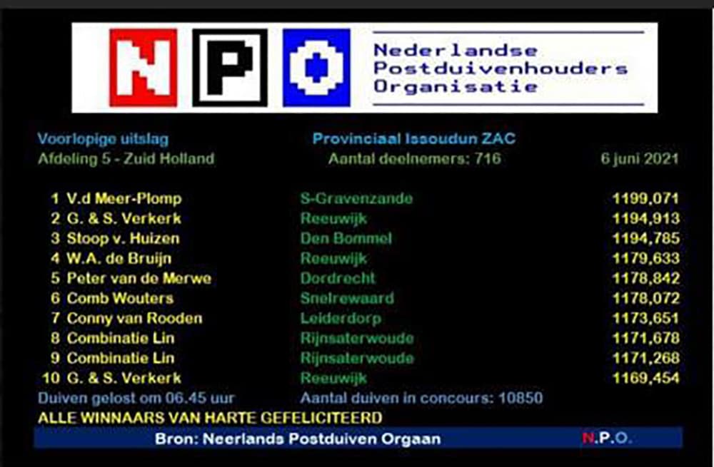 Comes as a surprise that the wind was not entirely favorable for Ad and Arie. Ad lives on the coast and with the NW wind a very early pigeon was not expected. But Lady Issoudun won the division competition with a speed of 1199 meters. Even a few meters away. In the club almost 40 minutes loose in the Westland combination about 1315 pigeons more than half an hour loose……