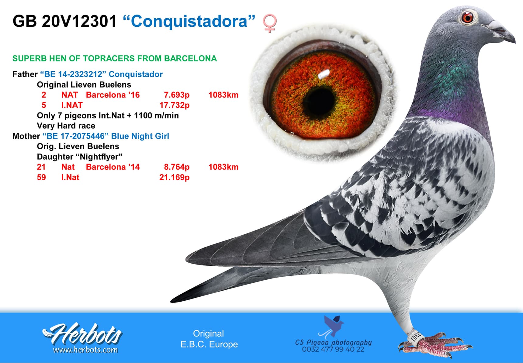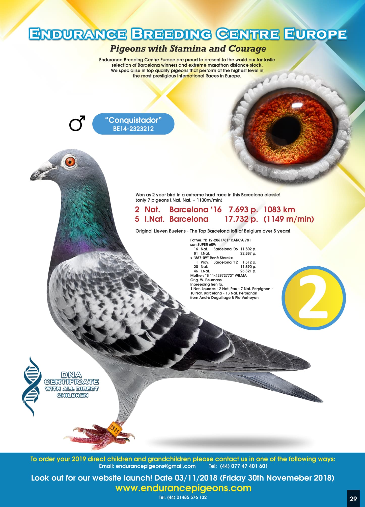 In 2016 it was Lieven Buelens that won with the 2-year old cock “Conquistador” in very though circumstances 2nd National against 7,693 old pigeons ( 5th I.Nat 17,732b ). The blood of Lieven Buelens is going around already for years on Barcelona and that’s why the purchase and to get this top pigeon to England at a young age. He is being coupled to his own strain over here ( Daughter “Nightflyer” 21st National Barcelona 8,764 pigeons ).
