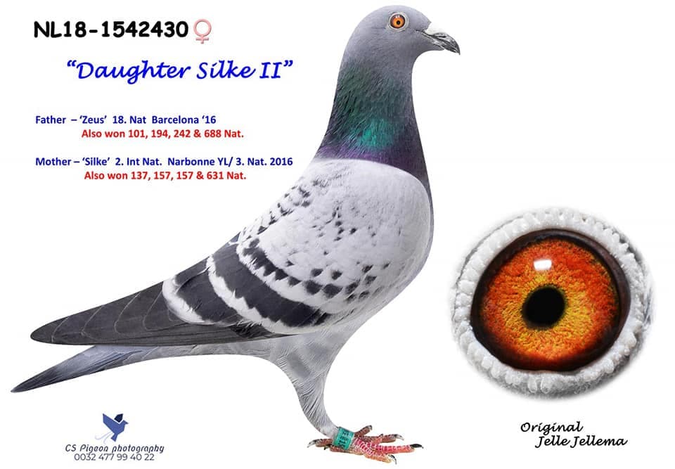 We all know the story from top hen “Silke” from Jelle Jellema. The top fancier out of Holland that won with this hen inn 2016 the 2nd International Narbonne against 7,811 pigeons and in 2020 shined again with this same top hen and won again 1st National Barcelona 4,480b and 2nd International Barcelona 14,500b old birds. Unfortunately this hen was stolen in Autumn from the lofts of Jelle Jellema and that’s why this offer is even more exceptional.