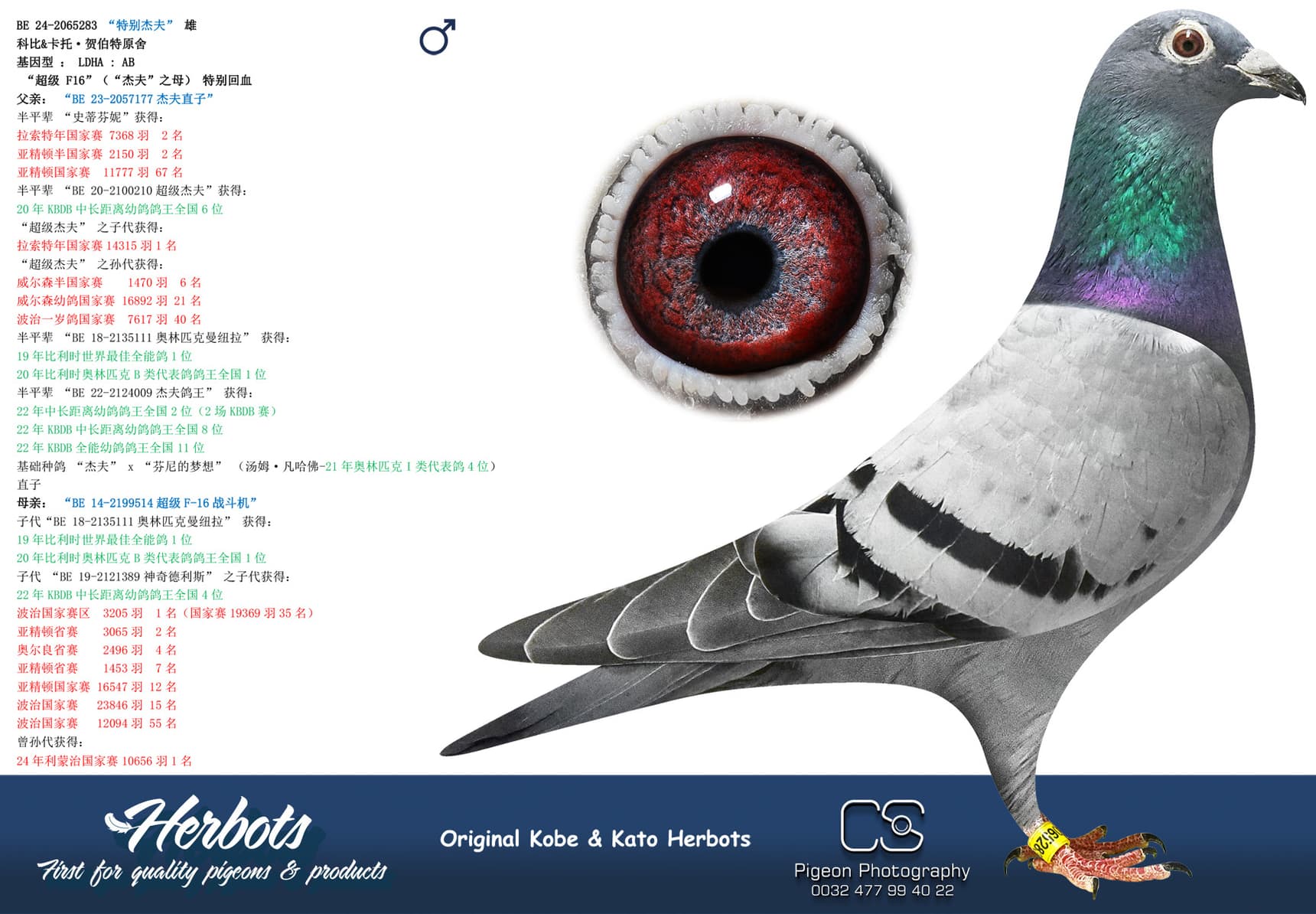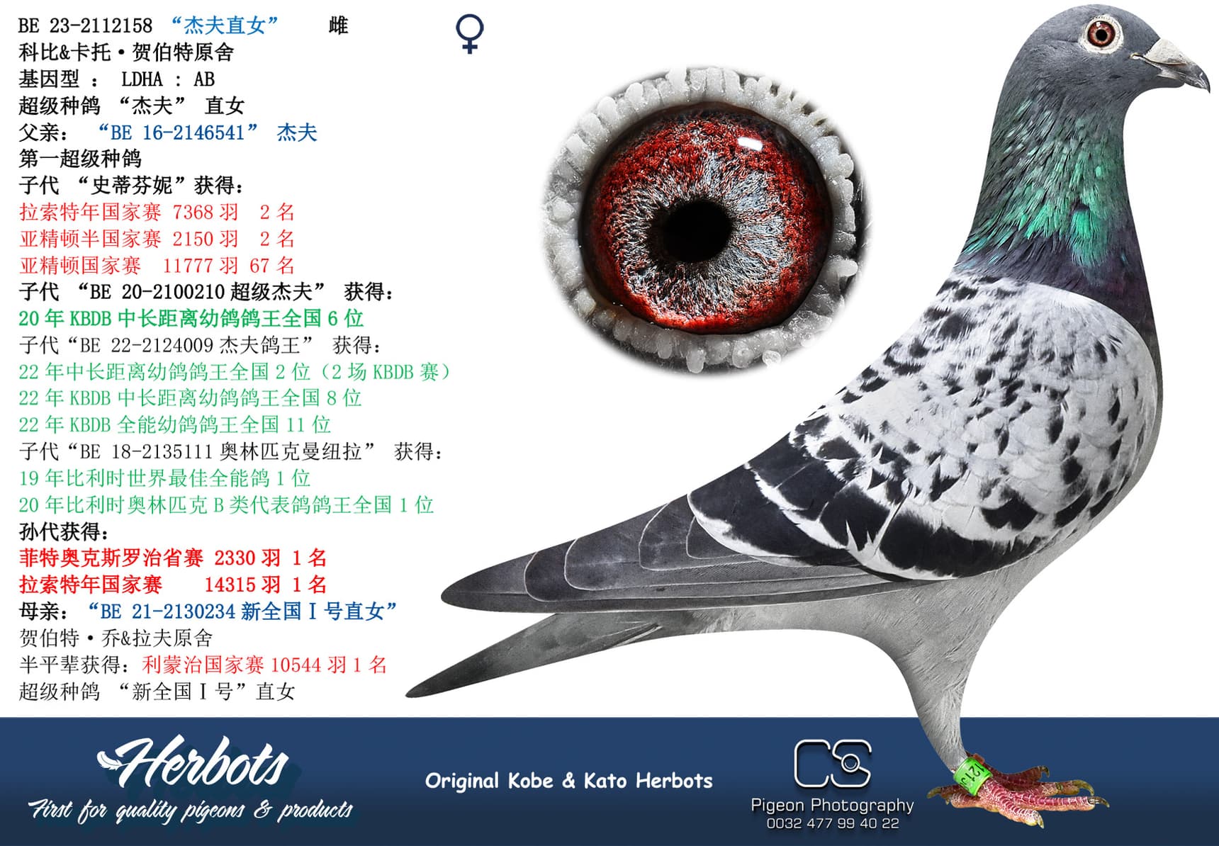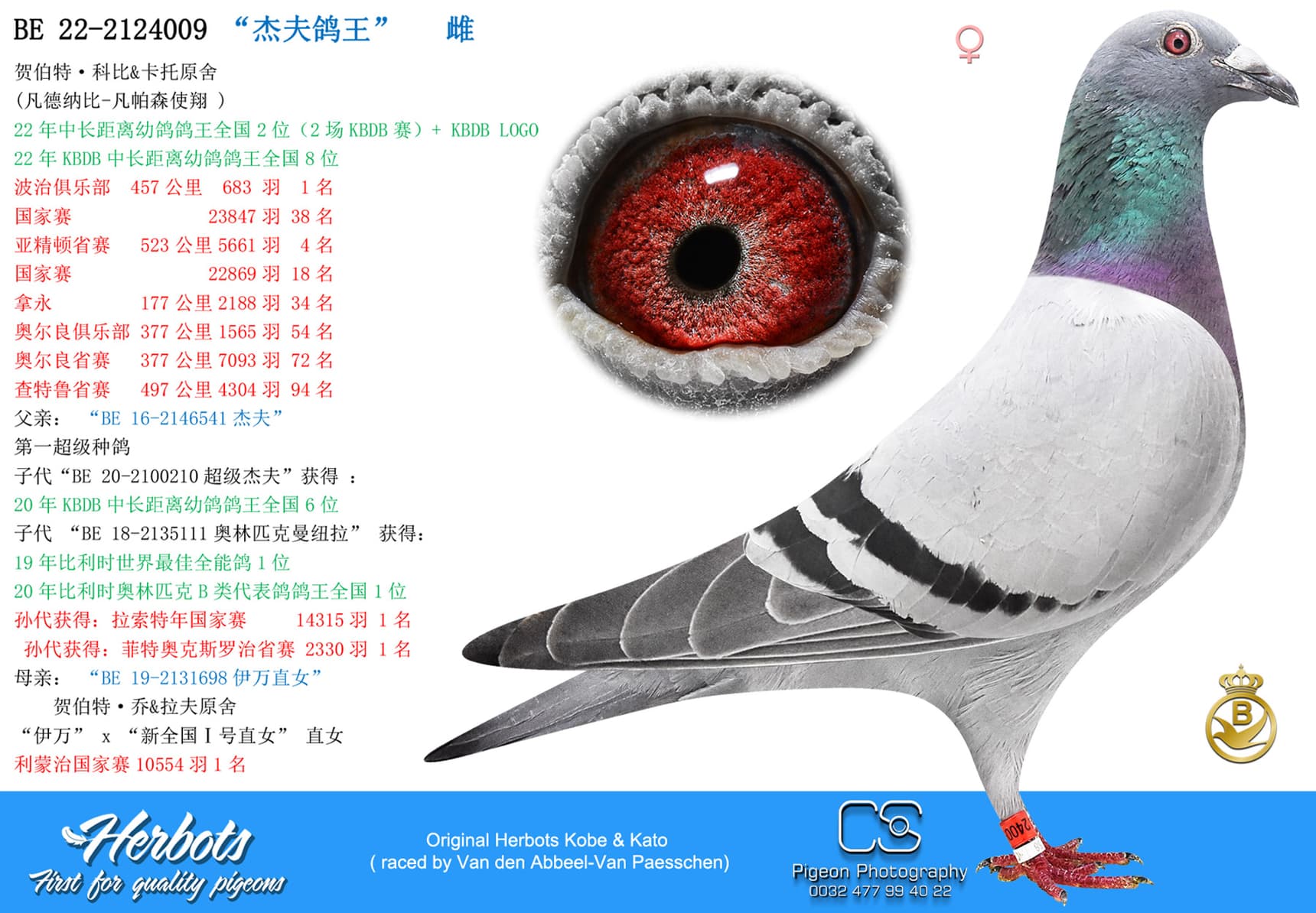 Winning 1st Noyon against 798 youngsters with a 50% Herbots pigeon. The mother is “Johanna” a daughter of “New National Geof” and granddaughter “Super Geof”. She is mother of several top pigeons 1 Melun 659p (12 Prov 9.427p) – 6 Quievrain 3.675p – 8 Pont 1.461p – 10 Pont 979p - 16 NPO Issoudun 2,093p – 19 Roye 1,511p - 20 NPO La Souterraine 2,085p – 23 NPO Issoudun 1,366p - ……