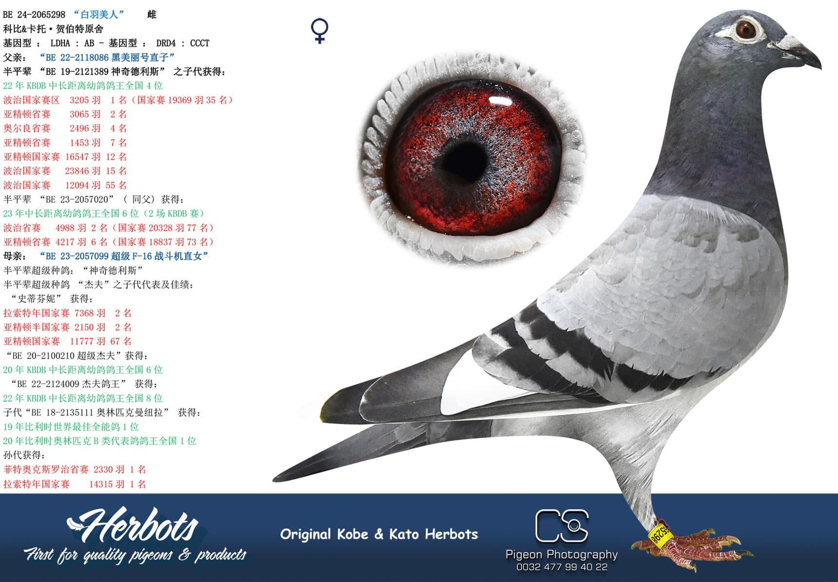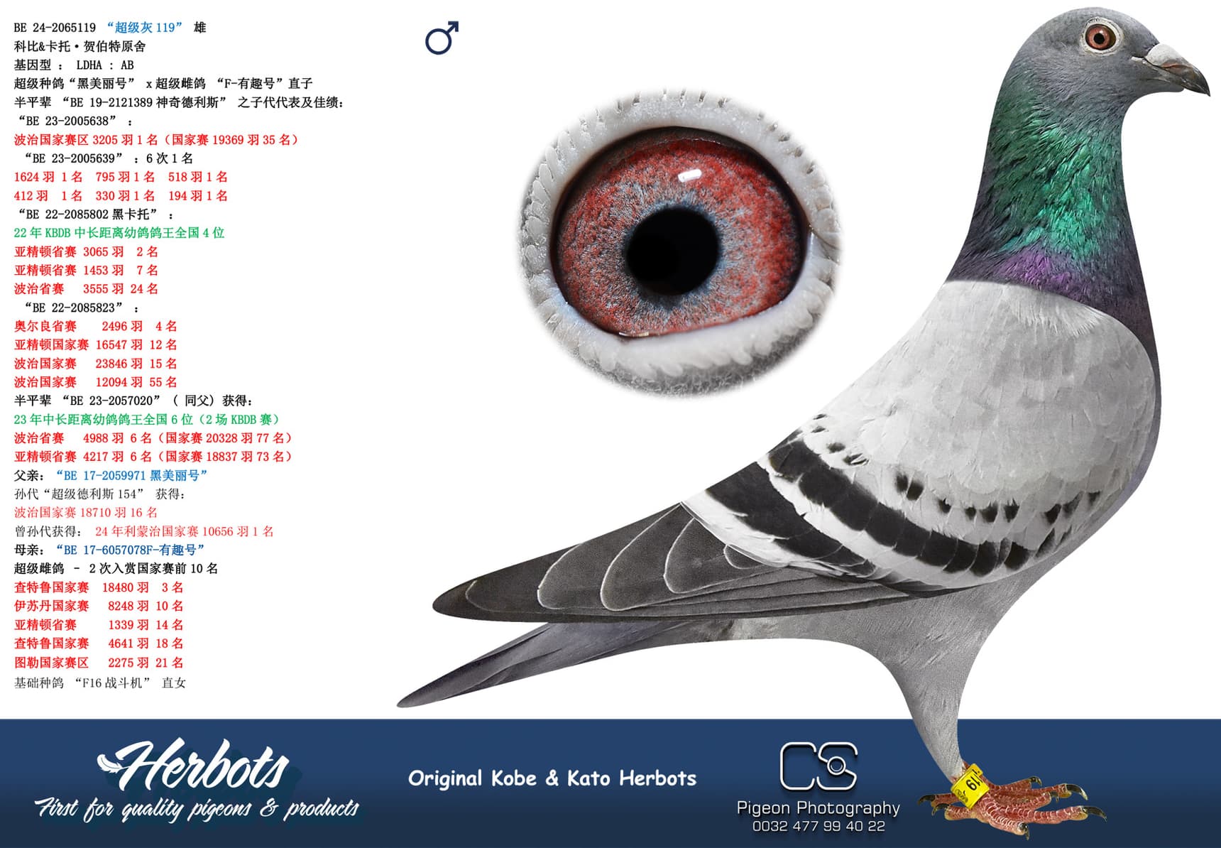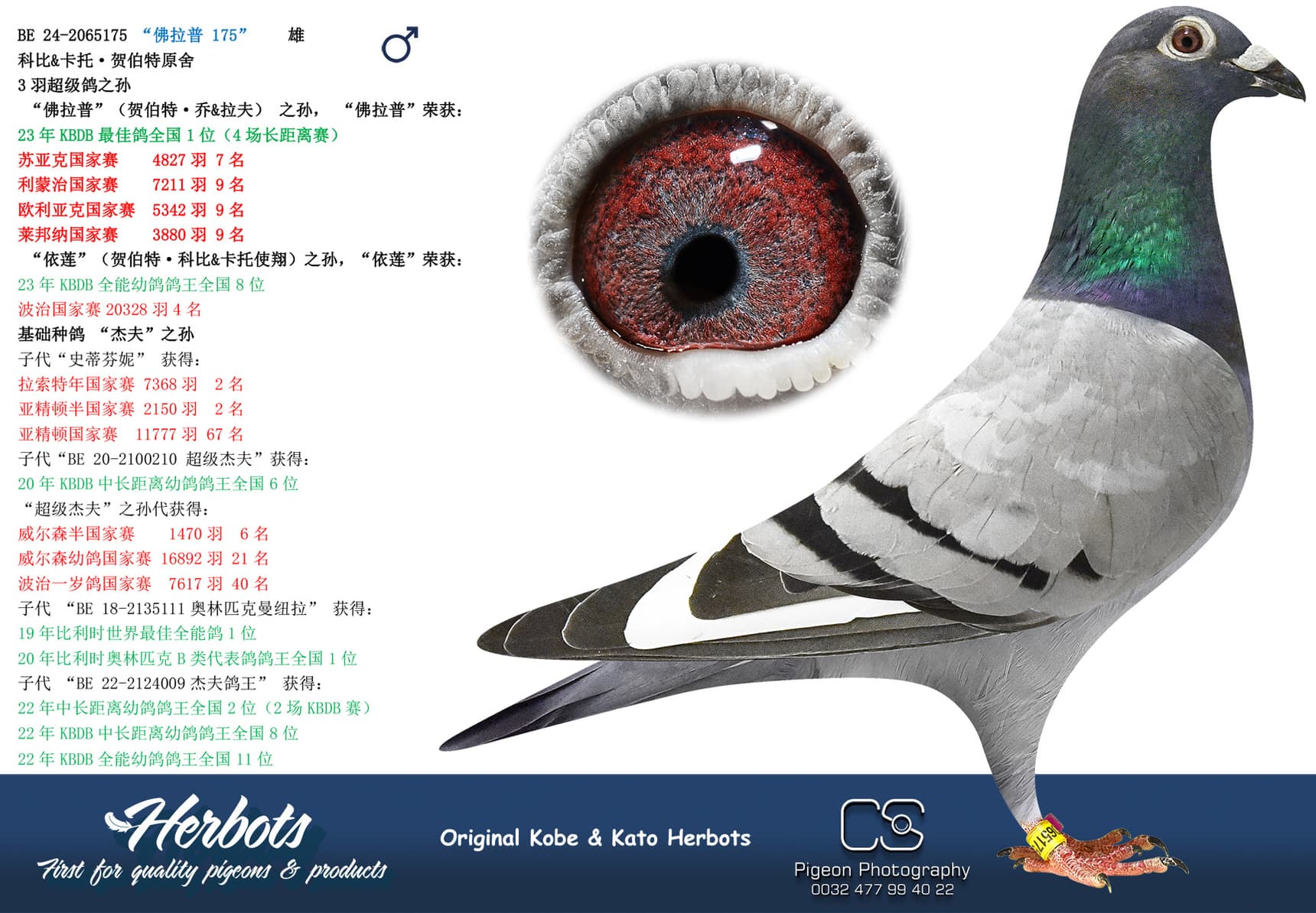 Winning 1st Noyon against 798 youngsters with a 50% Herbots pigeon. The mother is “Johanna” a daughter of “New National Geof” and granddaughter “Super Geof”. She is mother of several top pigeons 1 Melun 659p (12 Prov 9.427p) – 6 Quievrain 3.675p – 8 Pont 1.461p – 10 Pont 979p - 16 NPO Issoudun 2,093p – 19 Roye 1,511p - 20 NPO La Souterraine 2,085p – 23 NPO Issoudun 1,366p - ……