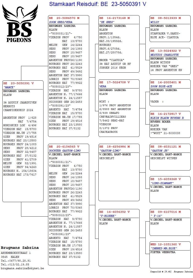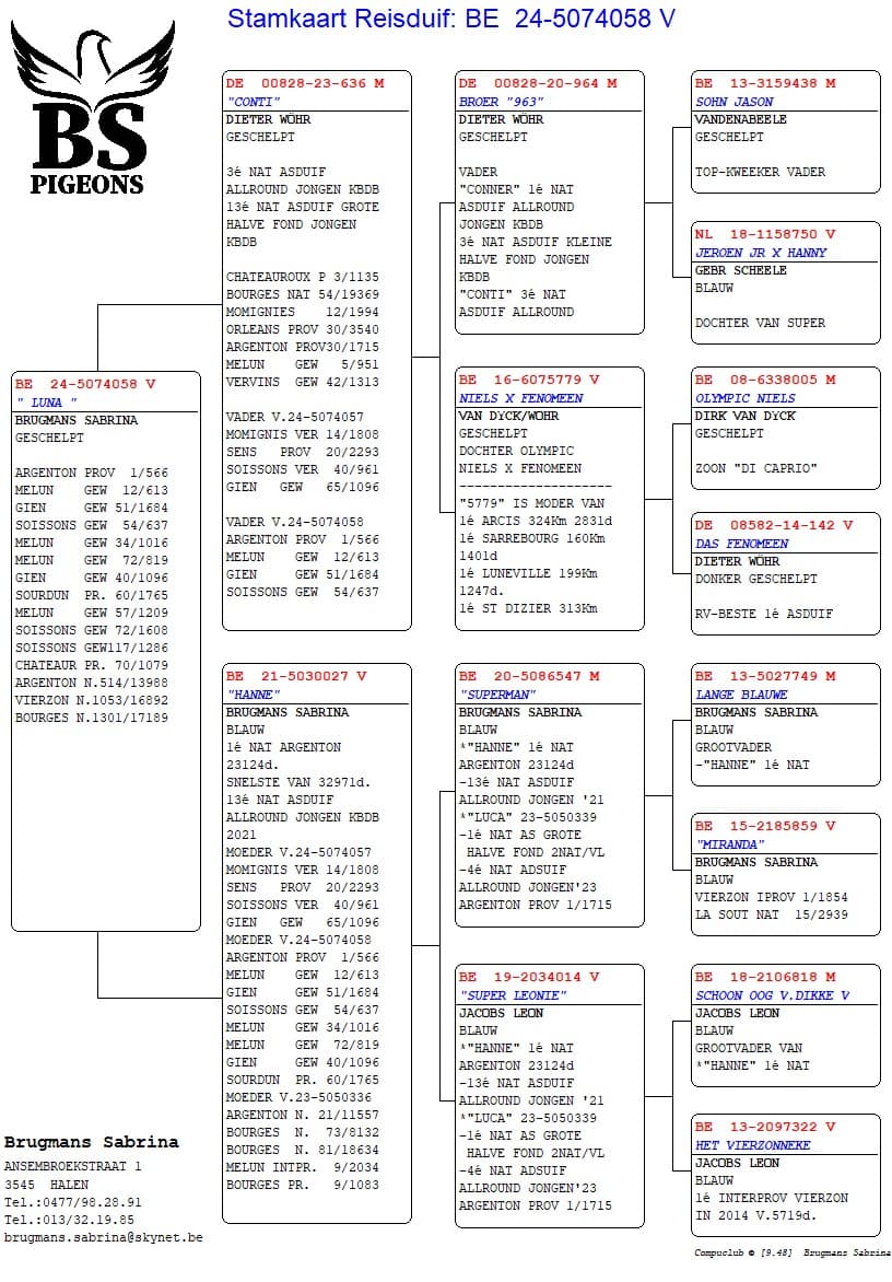 Son of "964/20" ½ brother "Lady" who won 3 x 1st x "779/16" Daughter Olympic Niels – Dirk Van Dijck, he won 3rd Olympiad Pigeon Cat. A Nitra 2013