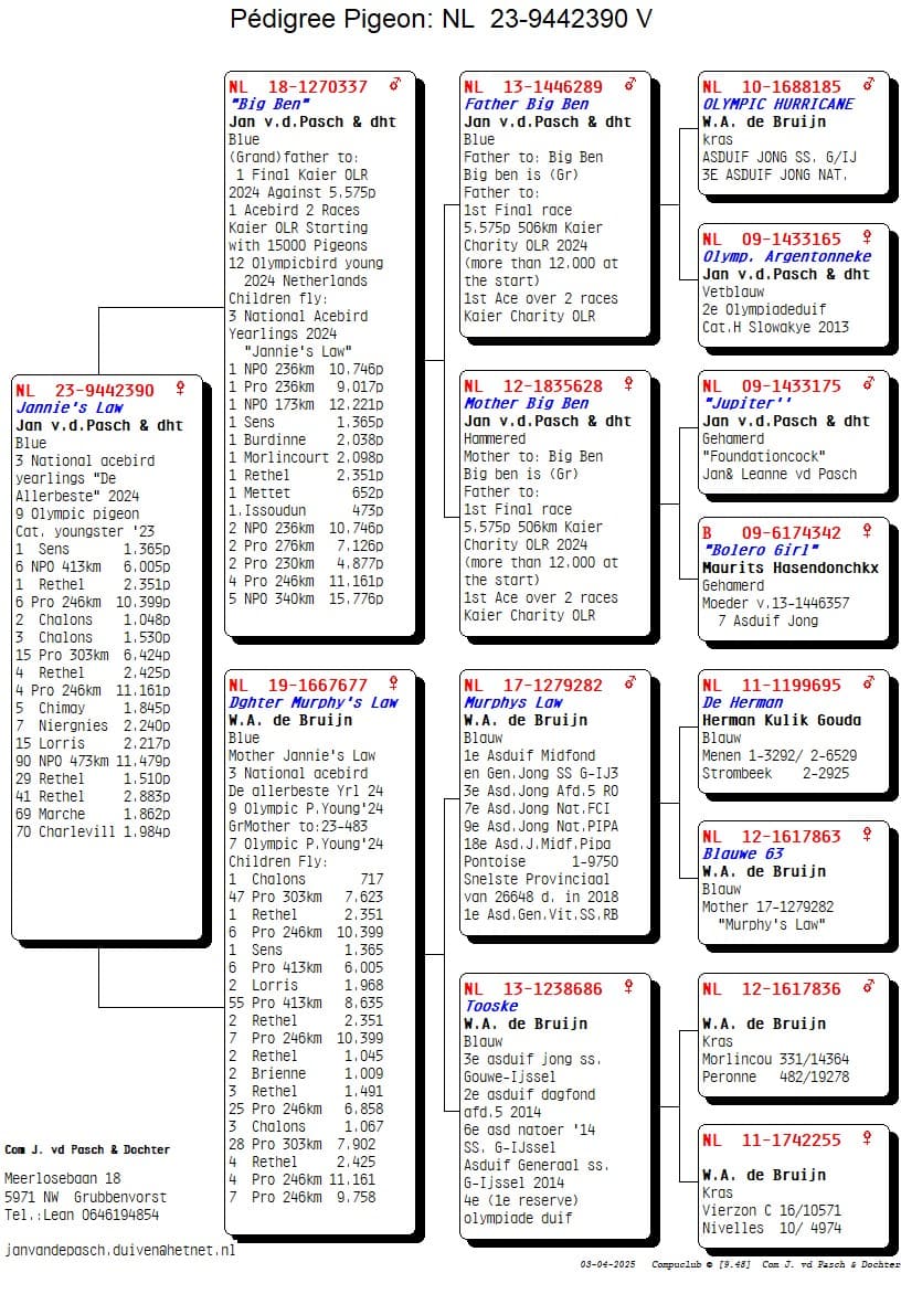 She is mother of “NL 23-9442930” Jannie’s Law Won 4 Prov Rethel 11,161p – 5 Chimay 1,845p – 6 Prov Rethel 10,399p