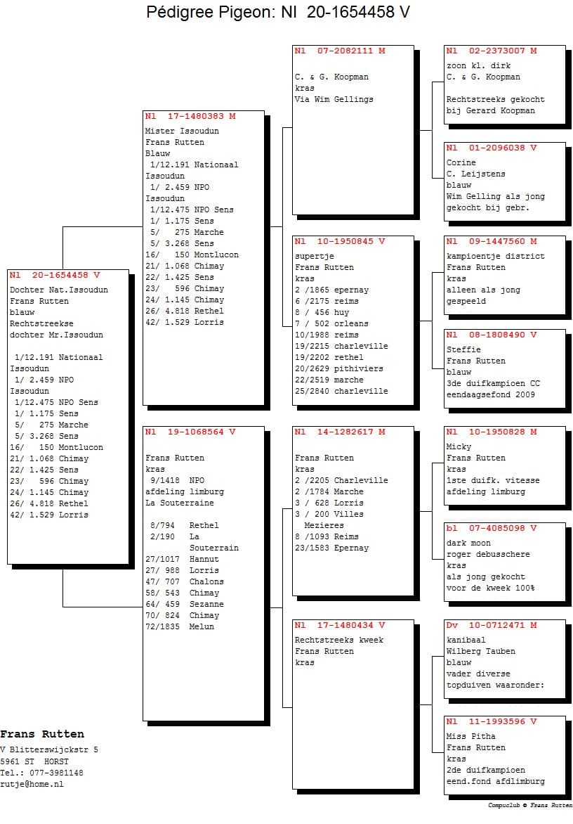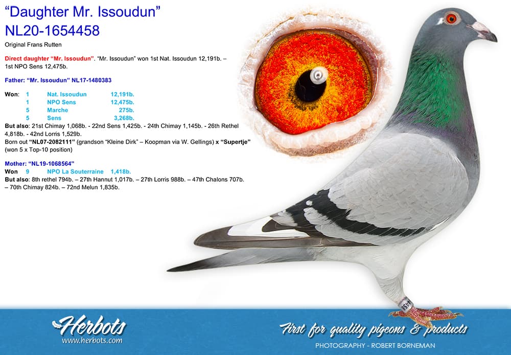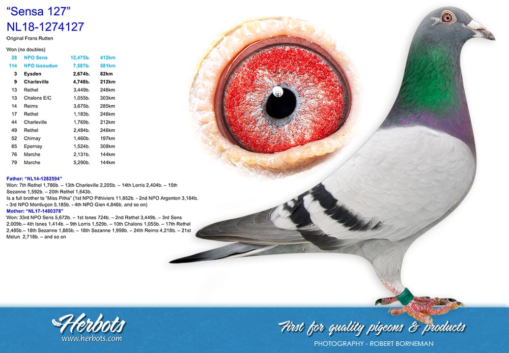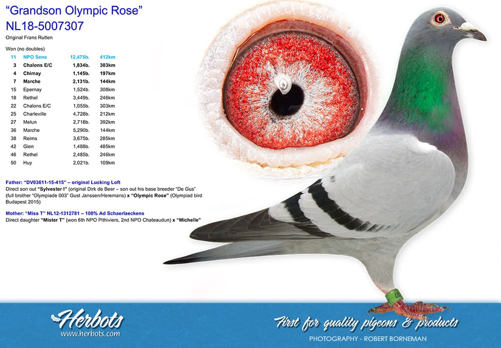 "Aike" only flew as a yearling and became 9th pigeon champion middle distance department Limburg, with a.o. 2nd 2694 d. NPO Argenton, 21st 9017 b. NPO Lorris, 28th 12917 b. NPO Lorris.