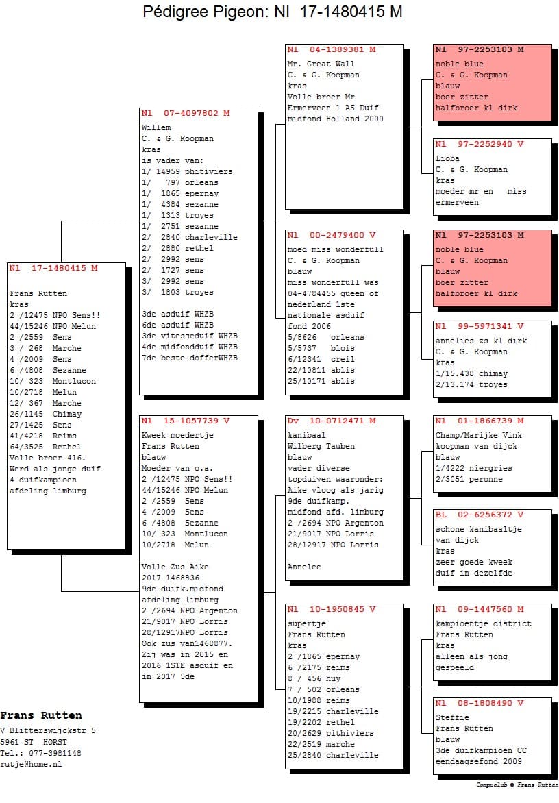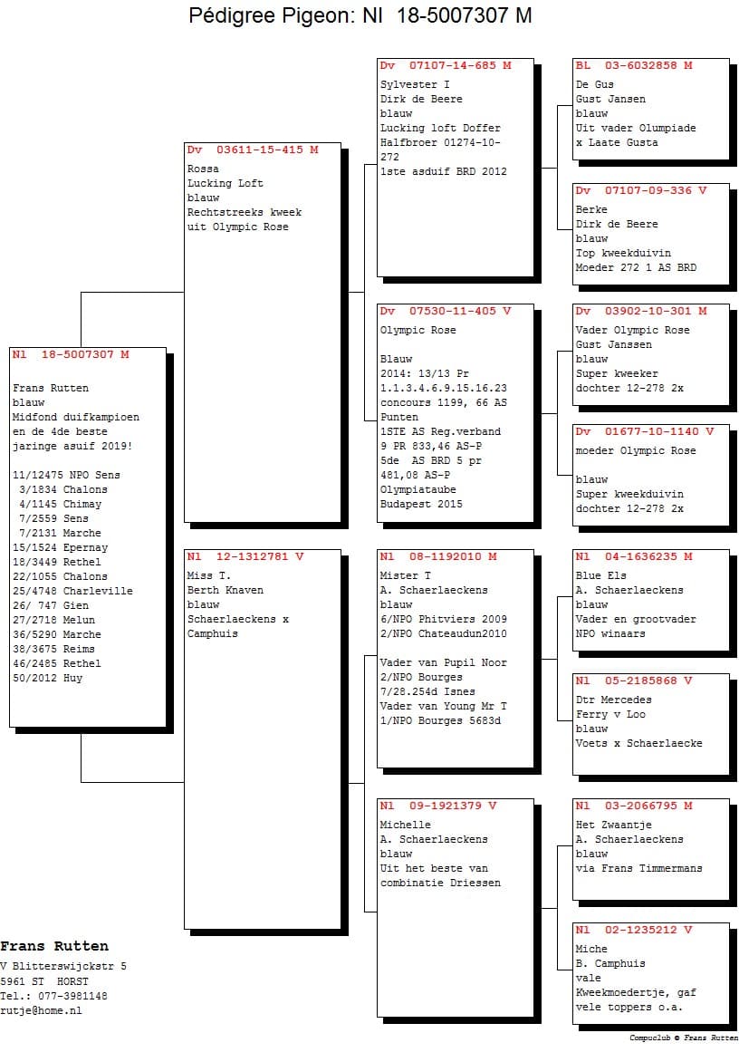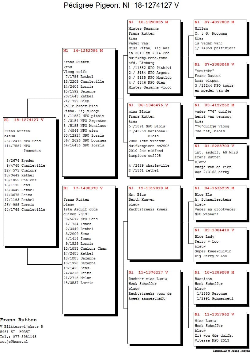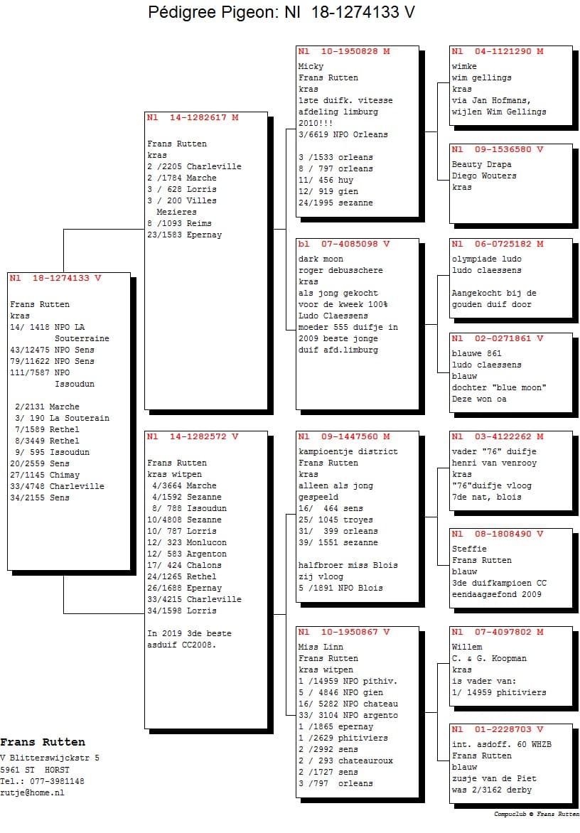 "Aike" only flew as a yearling and became 9th pigeon champion middle distance department Limburg, with a.o. 2nd 2694 d. NPO Argenton, 21st 9017 b. NPO Lorris, 28th 12917 b. NPO Lorris.