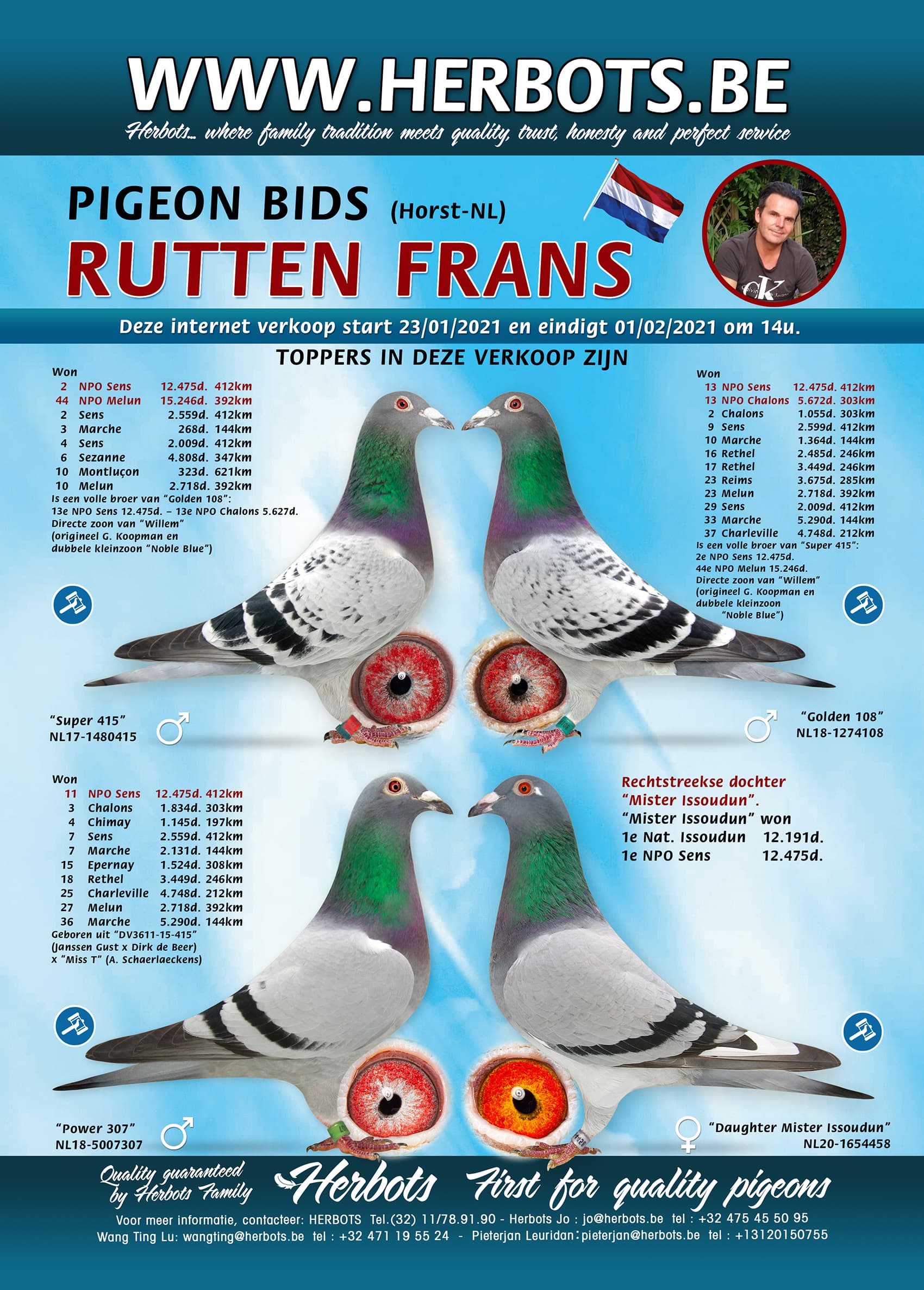 Frans offers at this moment a unique group of magnificent performance pigeons for sale on internet sale Pigeon Bids. Pure proven class... that much is certain!