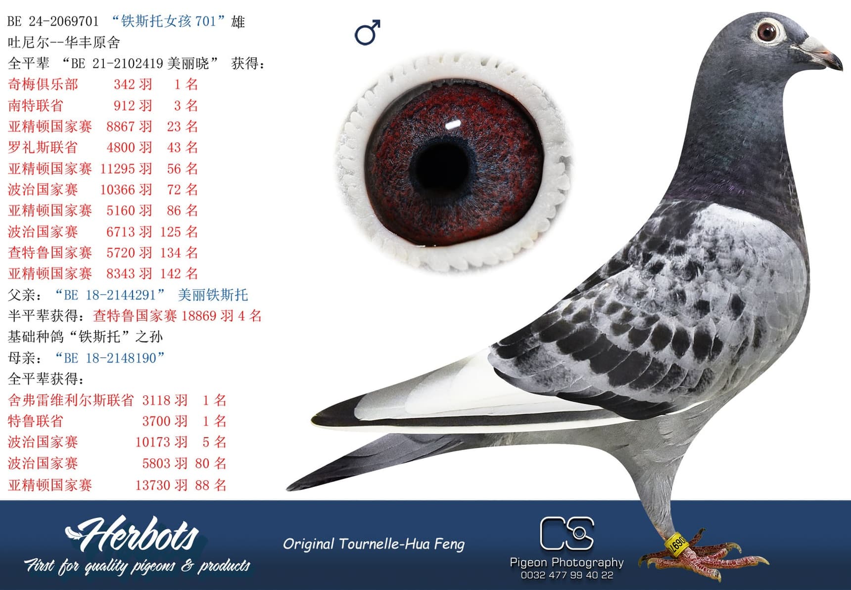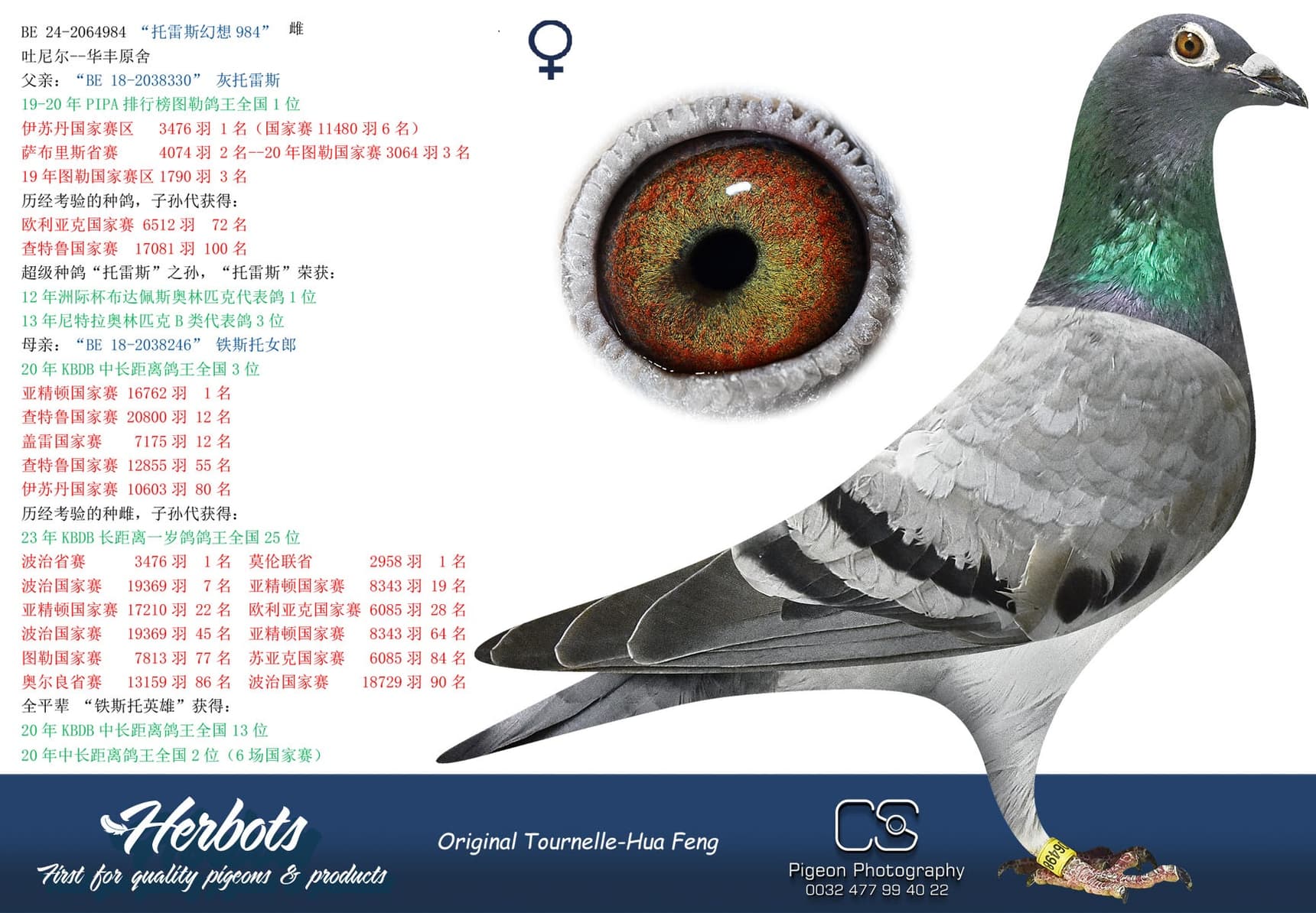 She is a daughter of “Torres Blue” 1 Nat Ace Pigeon Tulle 2019-2020 and has won, among others, 3rd Nat Tulle 3,064p - 6 Nat Issoudun 11,480p - 2 Prov Salbris 4,074p - 3 Nat (z) Tulle 1,790p. He was coupled to “Tiesto Lady” who became 3rd National Ace Pigeon GMD KBDB 2020 and grew into a super breeding hen in the breeding loft. She is a full sister of “Tiesto's Hero” who was in the previous sale as father. Both are children of the super couple “National Hero” x “Fantasy Lin” where many top pigeons are bred by Davy and they are doing really well here.