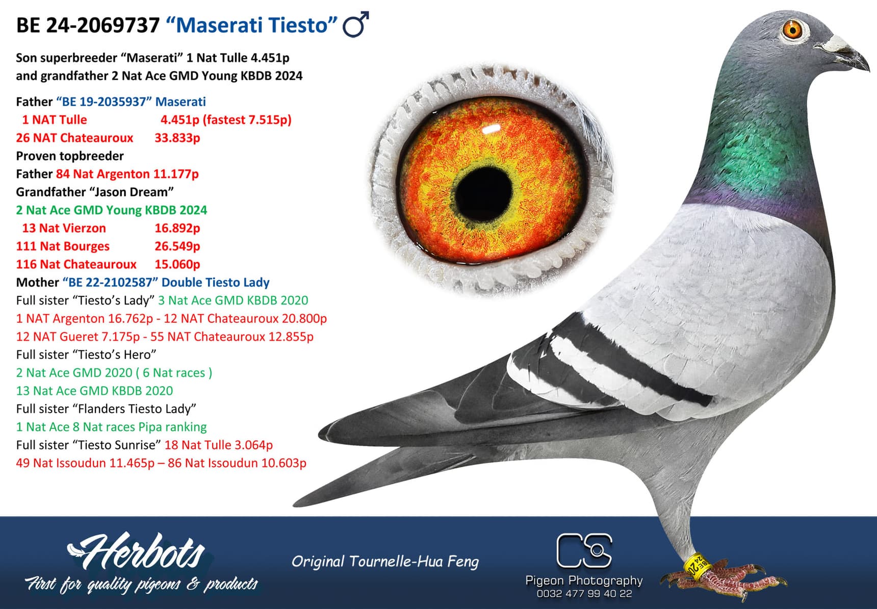 He is a son of “Maserati” 1 Nat Tulle 4,451p (fastest of 7,515p) – 26 Nat Chateauroux 33,833p” and became grandfather of “Jason Dream” in 2024. This young star became 2nd Nat. Ace Pigeon GMD youngsters KBDB 2024. A full sister of "Tiesto's Lady" and "Tiesto's Hero" was also coupled to this.