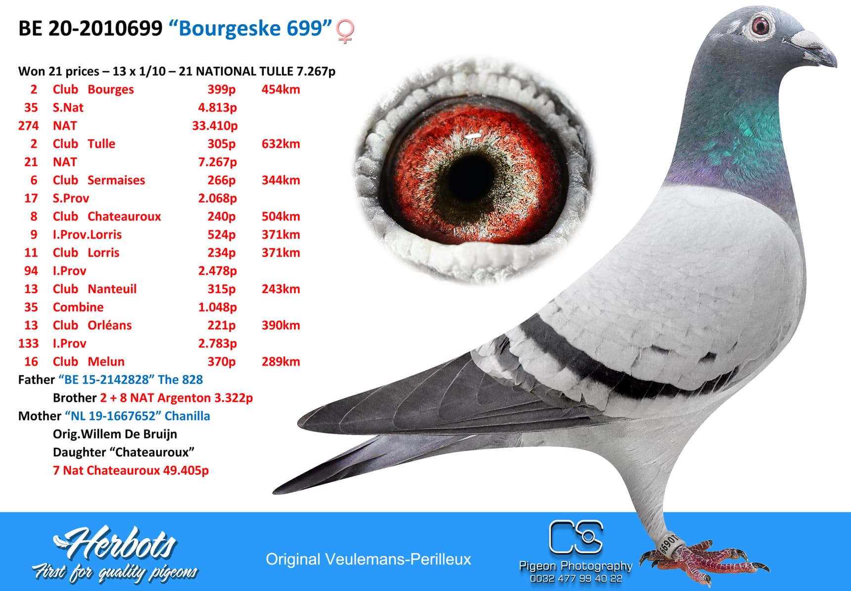 Her father is “Rinus” 1st Nat La Souterraine 9.602p ( fastest of 17.219p ) and proven top breeder of several pigeons.