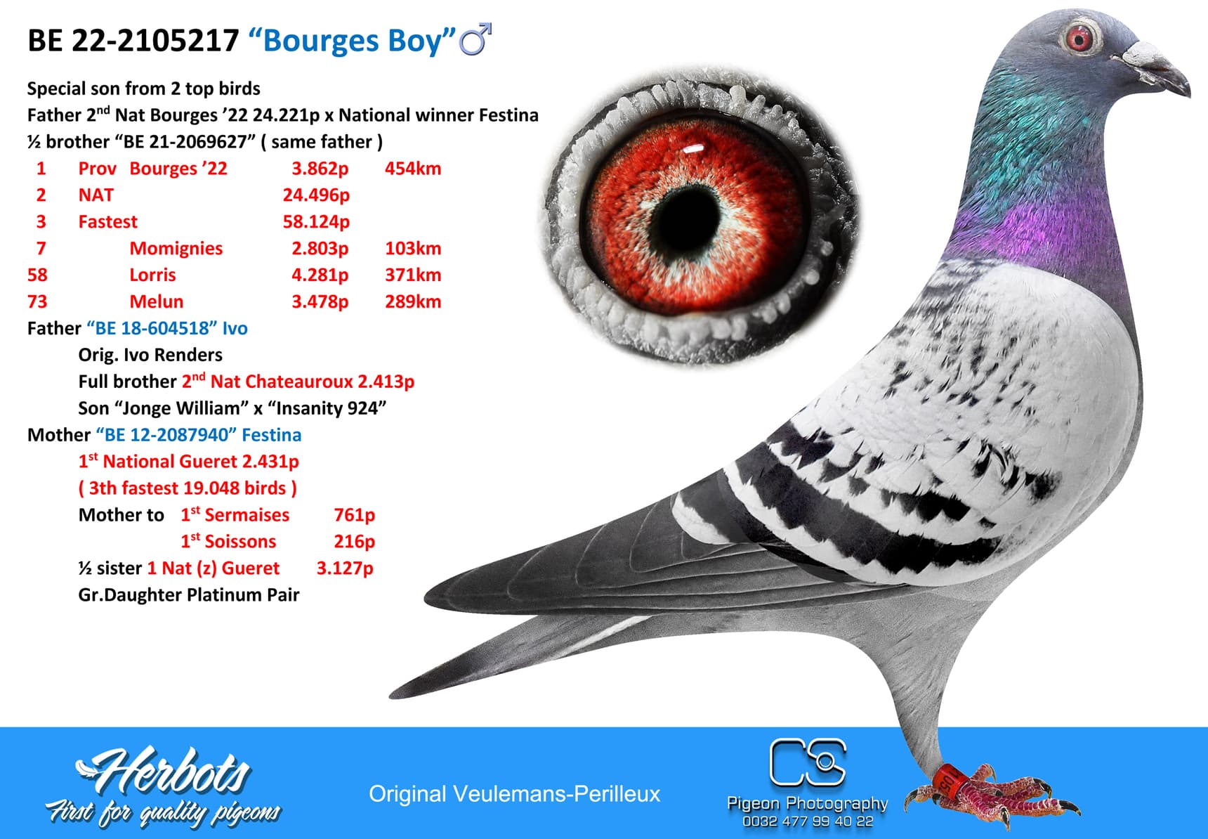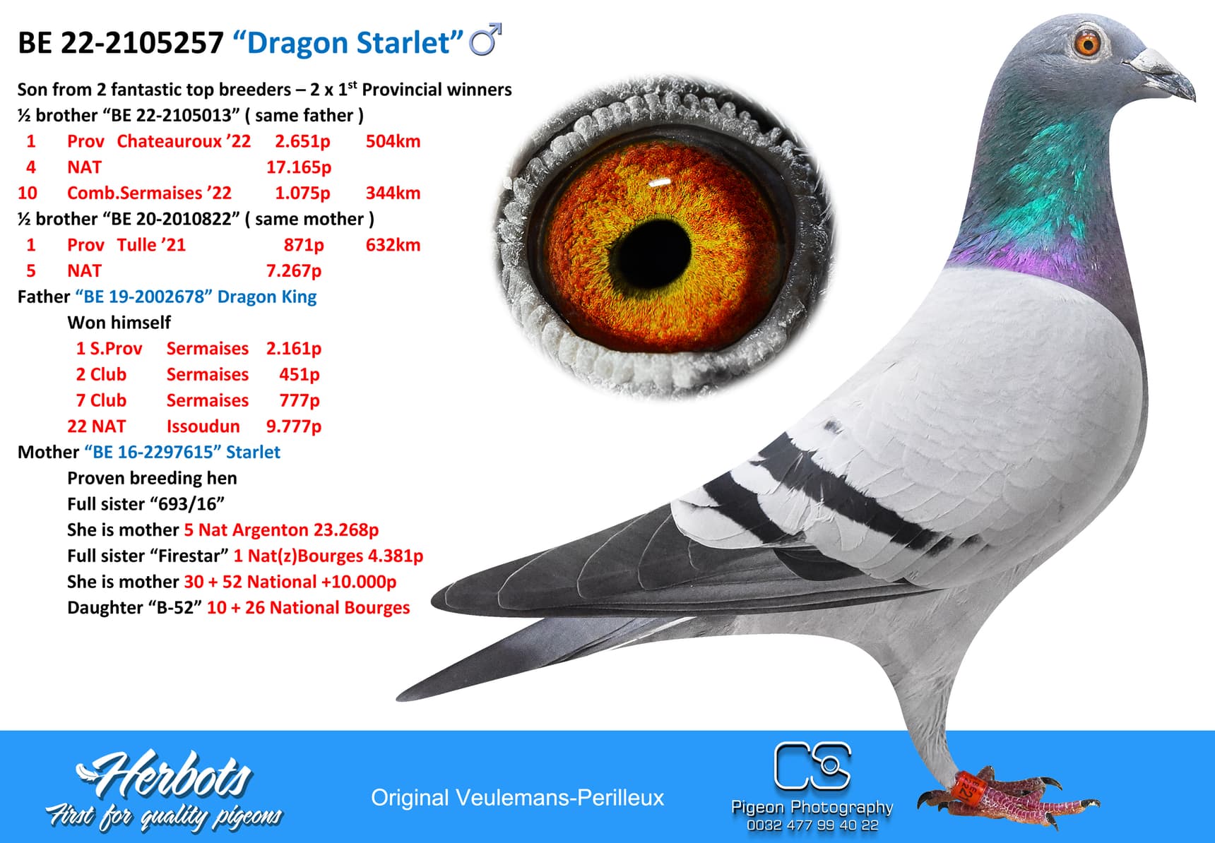 This cock comes from a very special pairing, his father is "Dragon King" who won 1st Sermaises against 2,161 pigeons and 22nd National Issoudun against 9,777 pigeons and this season became father of 4th National Chateauroux 17,165 youngsters, his partner was "Starlet" she is then already mother of 5th National Tulle 7,267 yearlings in 2021 and is a daughter of "B-52" who won 10th and 26th National Bourges.