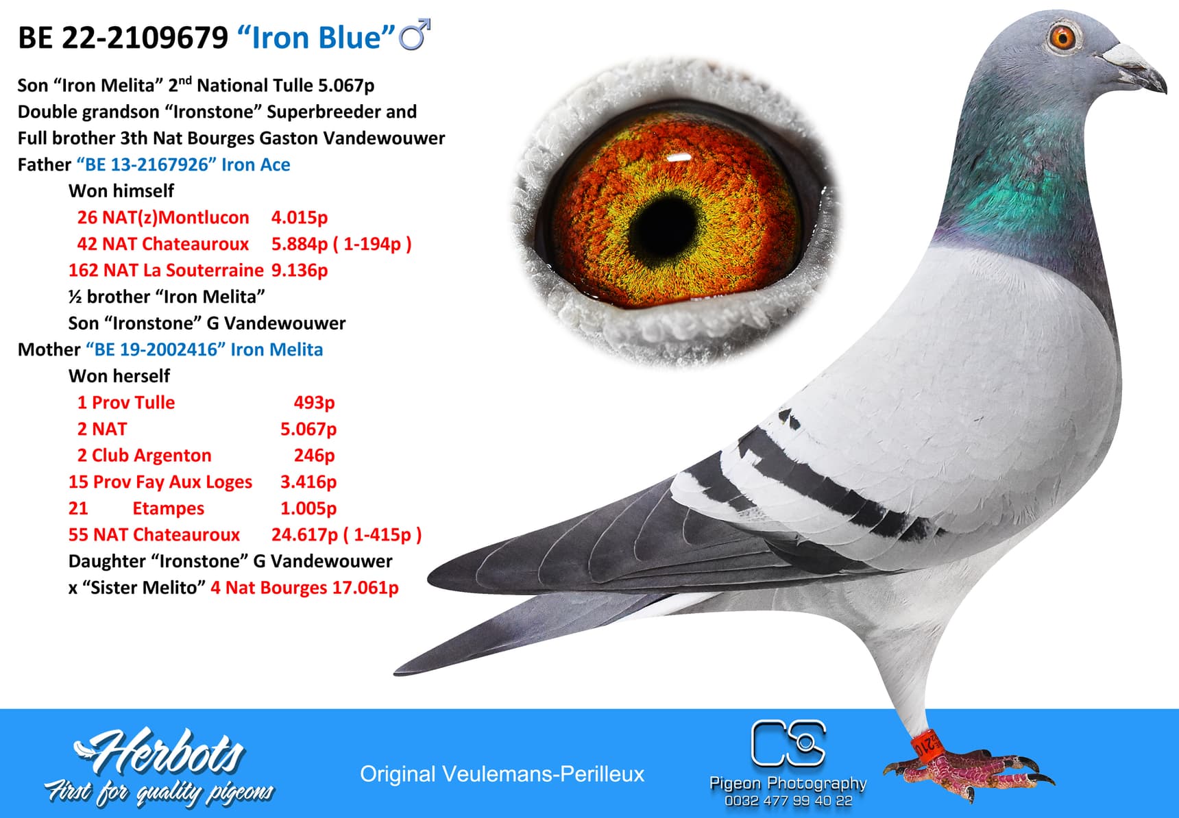 This cock is a son of “Iron Ace” 26 Nat(z) Montlucon 4,015p – 42 Nat Chateauroux 5,884p and was coupled to super hen “Iron Melita” 2nd National Tulle 5,067 pigeons and 55th National Chateauroux 24,617 pigeons. This top hen has been in the breeding loft since her performance from Tulle.