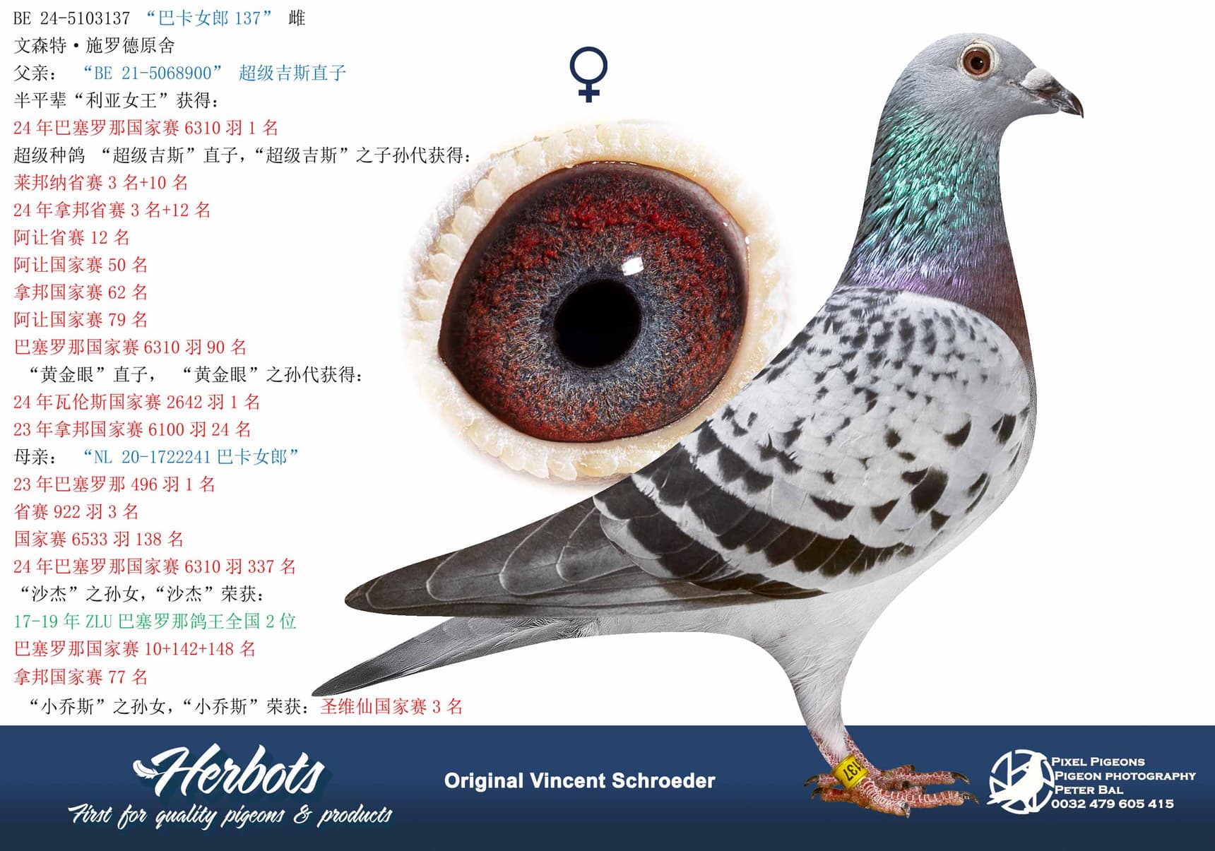For the first time, children from “Queen Lea” herself, her parents and her nest sister will be sold via our website www.herbots.be. Something very special for the Barcelona specialists among us. The last 2 pigeons come from “Lady Barca” who won 3rd Provincial Barcelona in 2023 and has now classified her well again.